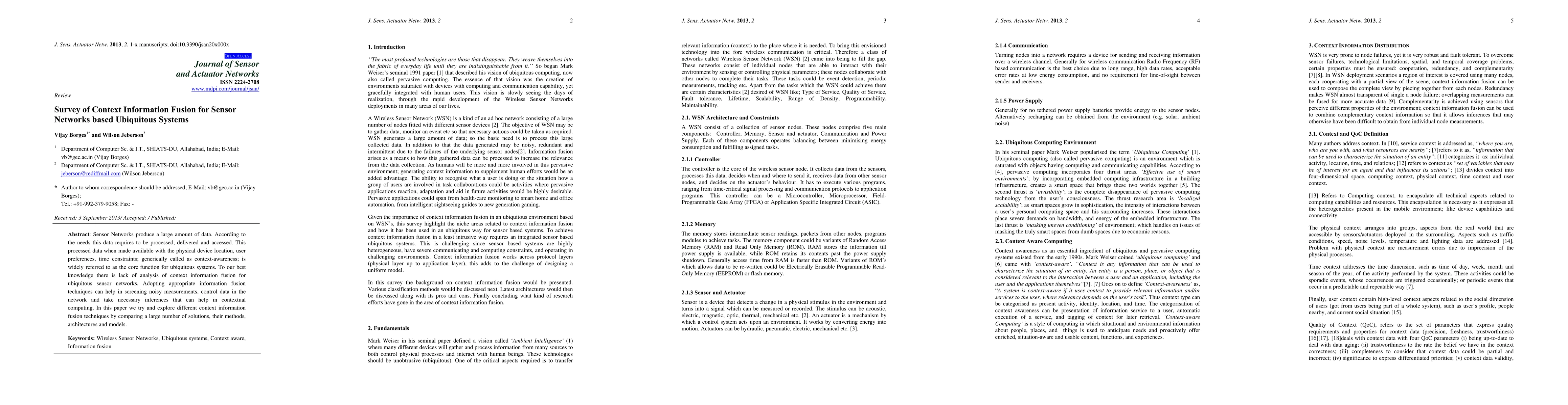 This paper surveys context information fusion techniques for ubiquitous sensor networks, analyzing various methods, architectures, and models to improve data processing, reduce noise, and enhance contextual computing. The study aims to fill the gap in existing analyses of context-awareness in sensor networks.