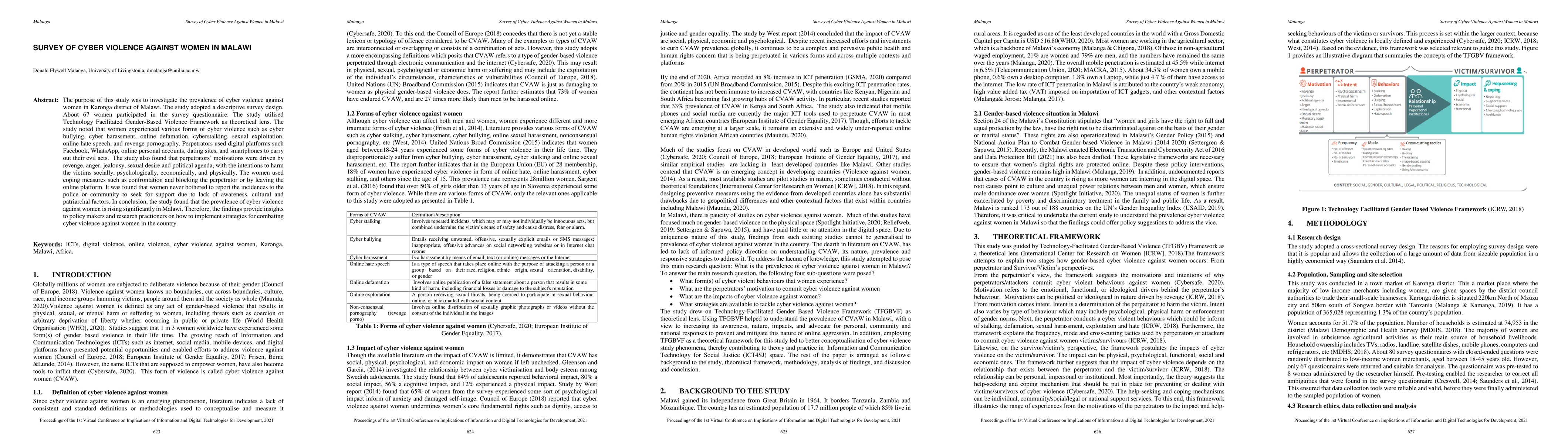 The purpose of this study was to investigate the prevalence of cyber violence against women in Karonga district of Malawi. The study adopted a descriptive survey design. About 67 women participated in the survey questionnaire. The study utilised Technology Facilitated Gender-Based Violence Framework as theoretical lens. The study noted that women experienced various forms of cyber violence such as cyber bullying, cyber harassment, online defamation, cyberstalking, sexual exploitation, online hate speech, and revenge pornography. Perpetrators used digital platforms such Facebook, WhatsApp, online personal accounts, dating sites, and smartphones to carry out their evil acts. The study also found that perpetrators' motivations were driven by revenge, anger, jealousy, sexual desire and political agenda, with the intentions to harm the victims socially, psychologically, economically, and physically. The women used coping measures such as confrontation and blocking the perpetrator or by leaving the online platform. It was found that women never bothered to report the incidences to the police or community to seek for support due to lack of awareness, cultural and patriarchal factors. In conclusion, the study found that the prevalence of cyber violence against women is rising significantly in Malawi. Therefore, the findings provide insights to policy makers and research practioners on how to implement strategies for combating cyber violence against women in the country.