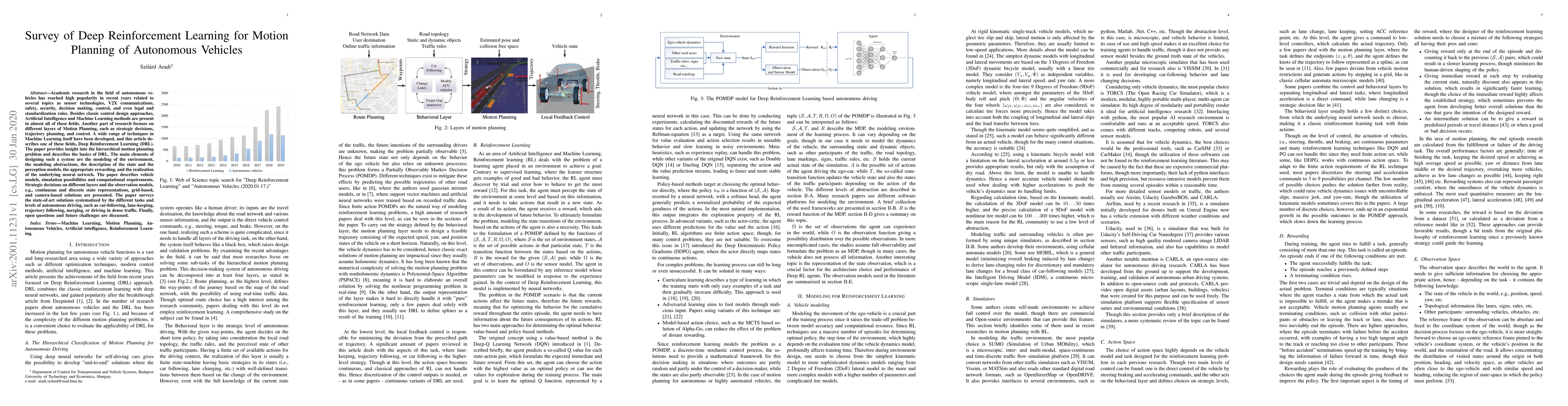 Academic research in the field of autonomous vehicles has reached high popularity in recent years related to several topics as sensor technologies, V2X communications, safety, security, decision making, control, and even legal and standardization rules. Besides classic control design approaches, Artificial Intelligence and Machine Learning methods are present in almost all of these fields. Another part of research focuses on different layers of Motion Planning, such as strategic decisions, trajectory planning, and control. A wide range of techniques in Machine Learning itself have been developed, and this article describes one of these fields, Deep Reinforcement Learning (DRL). The paper provides insight into the hierarchical motion planning problem and describes the basics of DRL. The main elements of designing such a system are the modeling of the environment, the modeling abstractions, the description of the state and the perception models, the appropriate rewarding, and the realization of the underlying neural network. The paper describes vehicle models, simulation possibilities and computational requirements. Strategic decisions on different layers and the observation models, e.g., continuous and discrete state representations, grid-based, and camera-based solutions are presented. The paper surveys the state-of-art solutions systematized by the different tasks and levels of autonomous driving, such as car-following, lane-keeping, trajectory following, merging, or driving in dense traffic. Finally, open questions and future challenges are discussed.