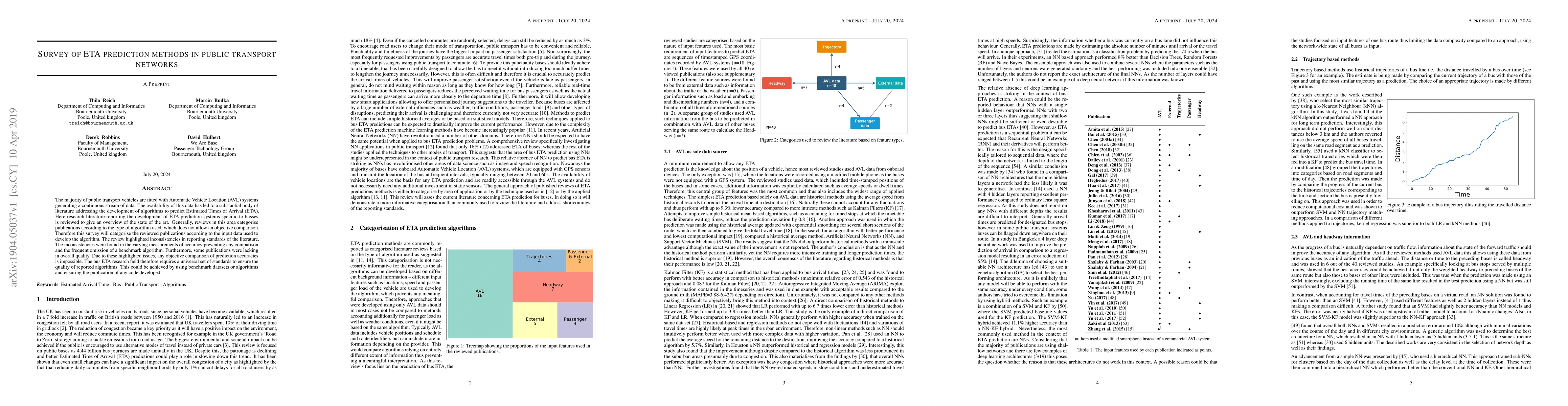 The majority of public transport vehicles are fitted with Automatic Vehicle Location (AVL) systems generating a continuous stream of data. The availability of this data has led to a substantial body of literature addressing the development of algorithms to predict Estimated Times of Arrival (ETA). Here research literature reporting the development of ETA prediction systems specific to busses is reviewed to give an overview of the state of the art. Generally, reviews in this area categorise publications according to the type of algorithm used, which does not allow an objective comparison. Therefore this survey will categorise the reviewed publications according to the input data used to develop the algorithm. The review highlighted inconsistencies in reporting standards of the literature. The inconsistencies were found in the varying measurements of accuracy preventing any comparison and the frequent omission of a benchmark algorithm. Furthermore, some publications were lacking in overall quality. Due to these highlighted issues, any objective comparison of prediction accuracies is impossible. The bus ETA research field therefore requires a universal set of standards to ensure the quality of reported algorithms. This could be achieved by using benchmark datasets or algorithms and ensuring the publication of any code developed.