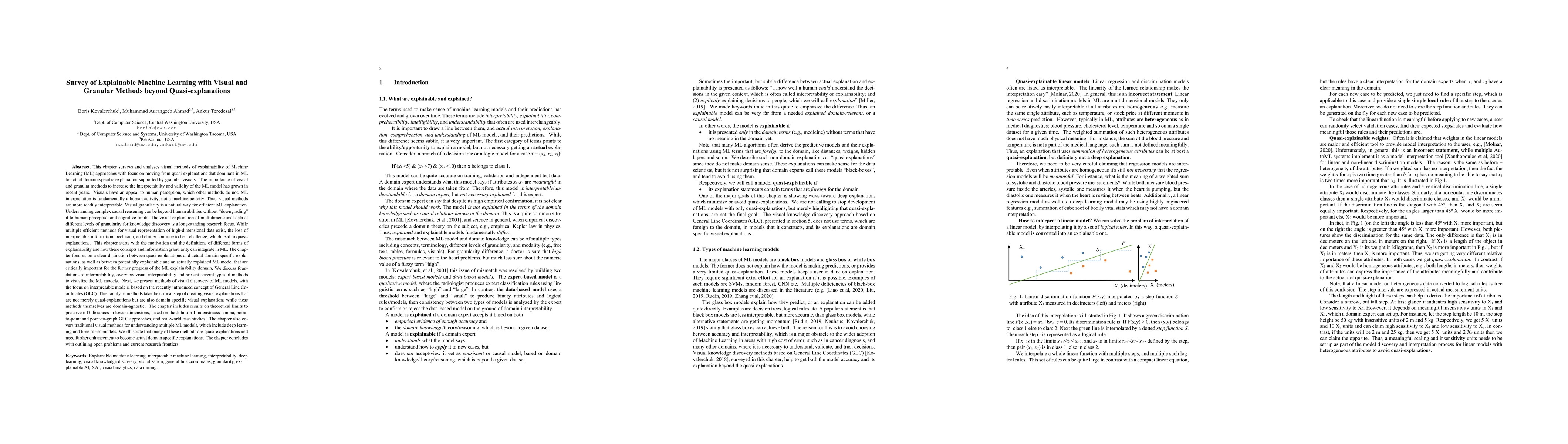 This paper surveys visual methods for explainable machine learning, focusing on transitioning from quasi-explanations to domain-specific visual explanations. It discusses interpretability foundations, visual techniques, and introduces General Line Coordinates (GLC) for creating domain-specific visual explanations while maintaining domain-agnosticism.