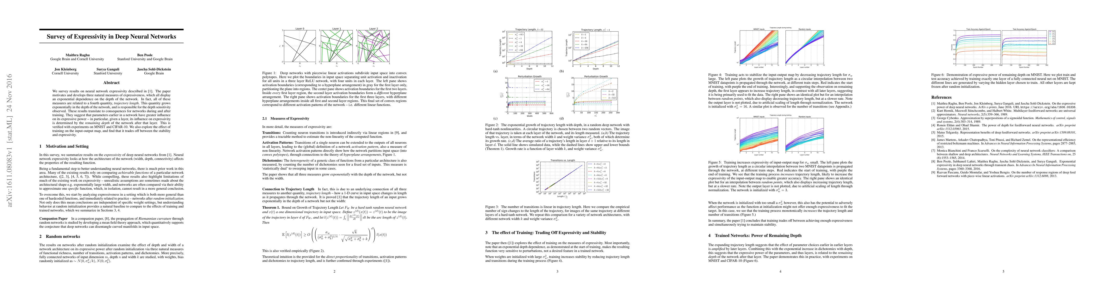 We survey results on neural network expressivity described in "On the Expressive Power of Deep Neural Networks". The paper motivates and develops three natural measures of expressiveness, which all display an exponential dependence on the depth of the network. In fact, all of these measures are related to a fourth quantity, trajectory length. This quantity grows exponentially in the depth of the network, and is responsible for the depth sensitivity observed. These results translate to consequences for networks during and after training. They suggest that parameters earlier in a network have greater influence on its expressive power -- in particular, given a layer, its influence on expressivity is determined by the remaining depth of the network after that layer. This is verified with experiments on MNIST and CIFAR-10. We also explore the effect of training on the input-output map, and find that it trades off between the stability and expressivity.