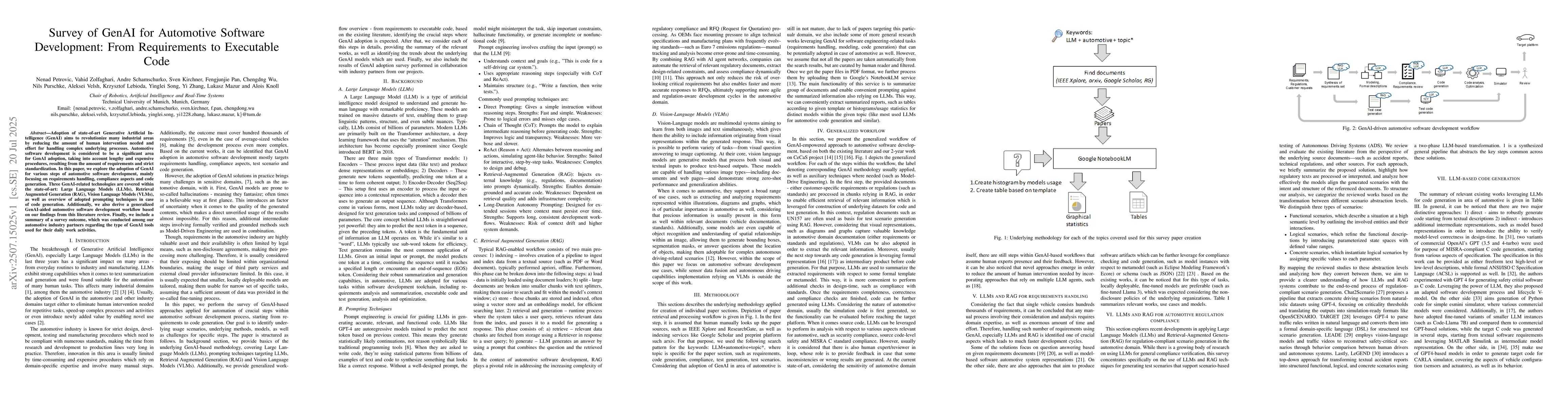 This paper offers a comprehensive review of GenAI adoption in automotive software development, identifying dominant models, prompting techniques, and challenges, thereby providing a valuable resource for both industry practitioners and researchers.