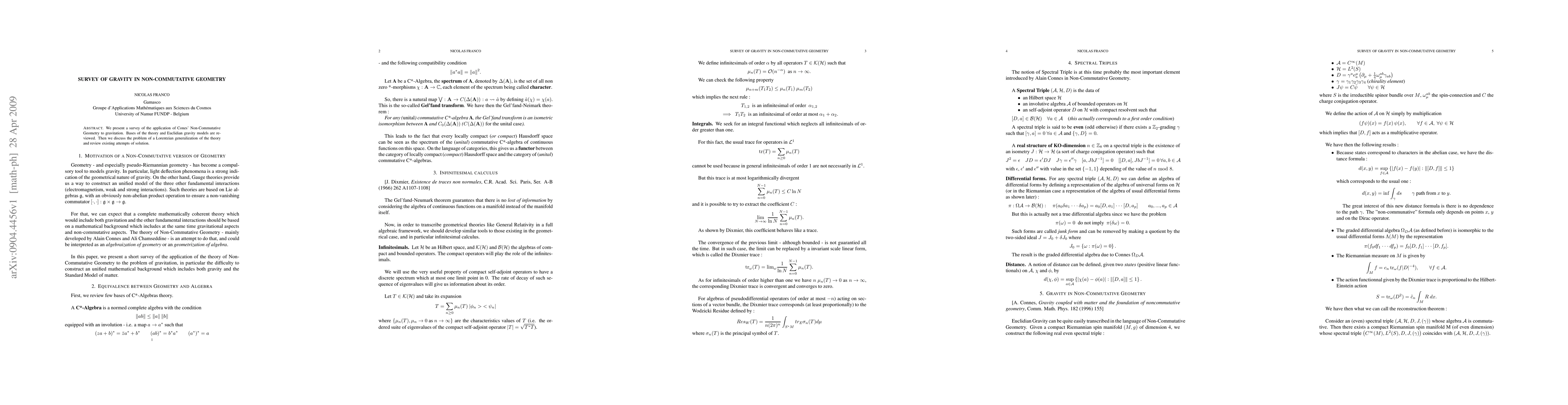 This paper surveys the application of Non-Commutative Geometry to gravity, reviewing its bases, Euclidean models, and attempts at a Lorentzian generalization, aiming to deepen understanding of gravitational forces.