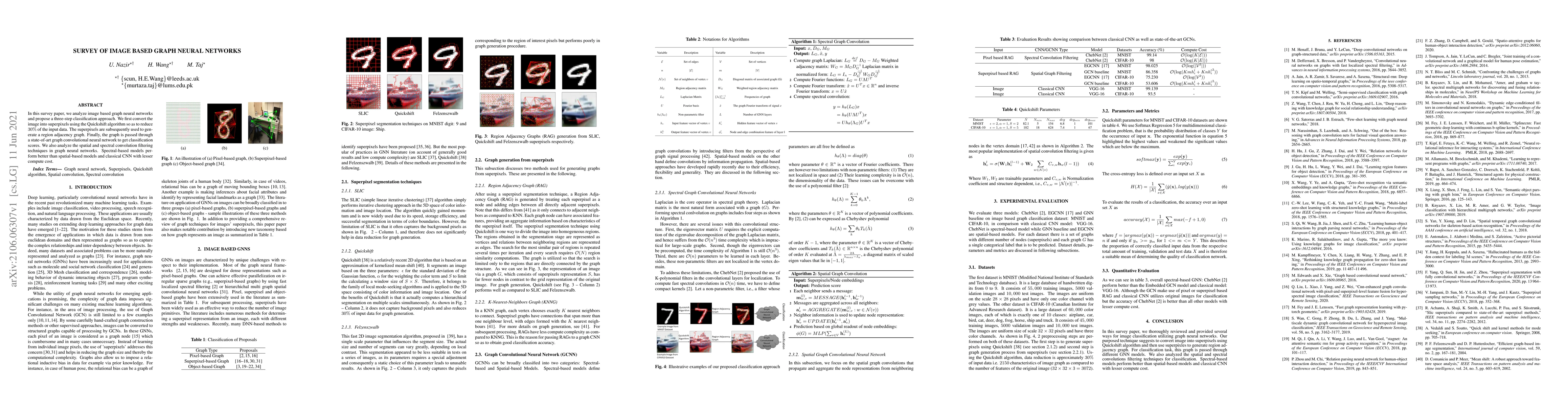 In this survey paper, we analyze image based graph neural networks and propose a three-step classification approach. We first convert the image into superpixels using the Quickshift algorithm so as to reduce 30% of the input data. The superpixels are subsequently used to generate a region adjacency graph. Finally, the graph is passed through a state-of-art graph convolutional neural network to get classification scores. We also analyze the spatial and spectral convolution filtering techniques in graph neural networks. Spectral-based models perform better than spatial-based models and classical CNN with lesser compute cost.