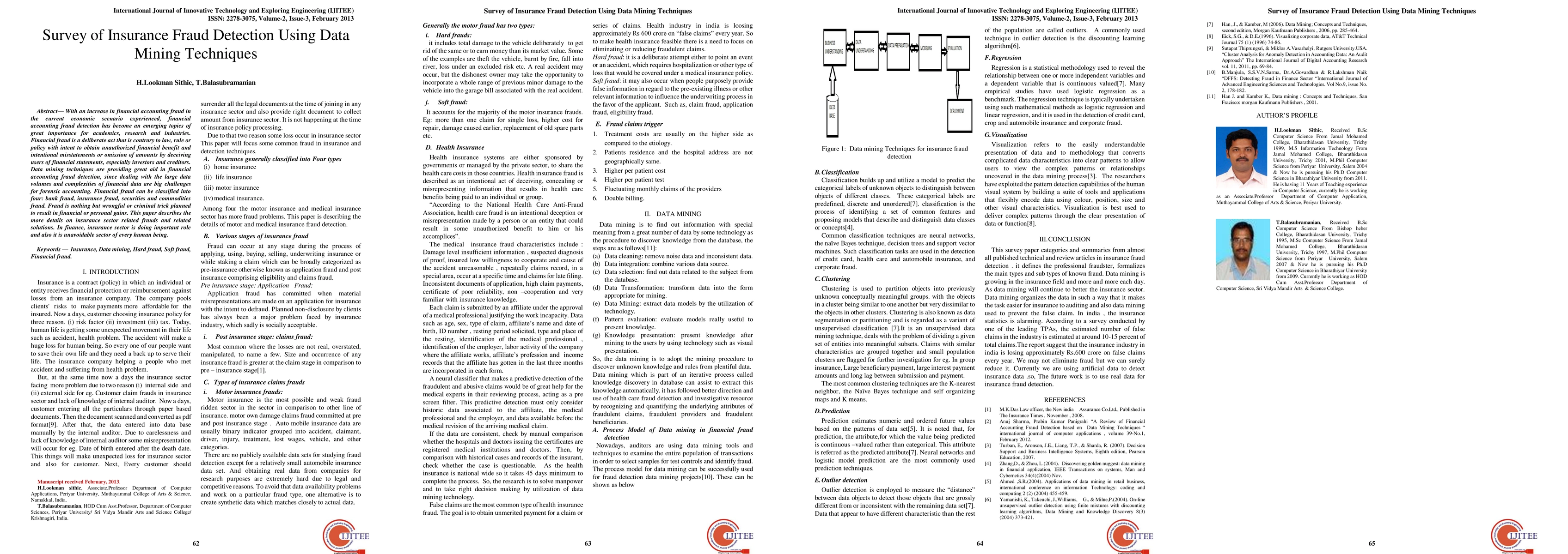 This paper surveys the application of data mining techniques to detect insurance fraud, emphasizing the challenges of handling large and complex financial data. It focuses on the types of fraud within the insurance sector and the innovative solutions being developed to combat these fraudulent activities.