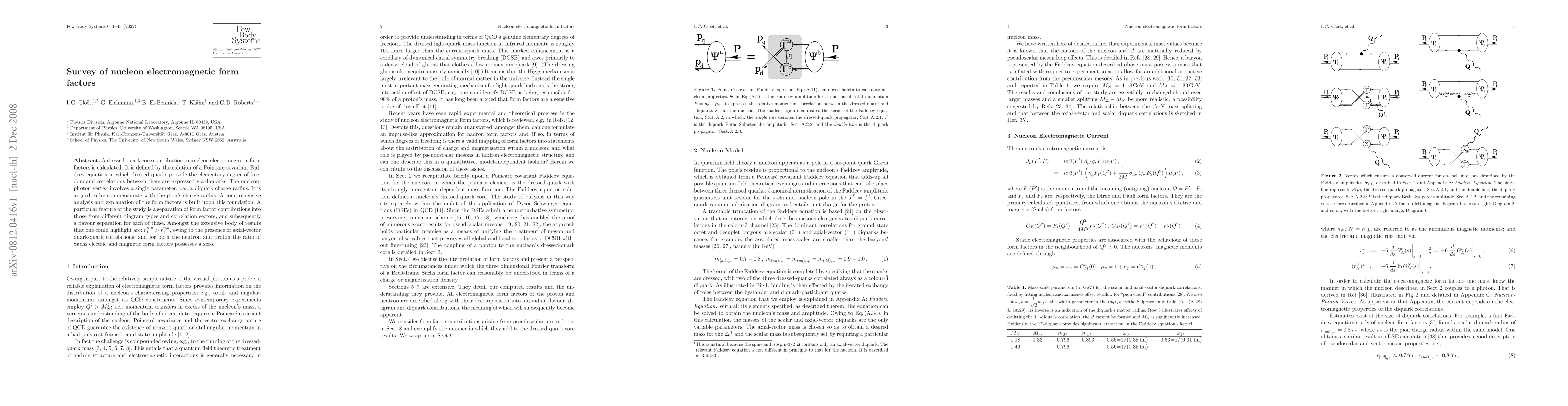 A dressed-quark core contribution to nucleon electromagnetic form factors is calculated. It is defined by the solution of a Poincare' covariant Faddeev equation in which dressed-quarks provide the elementary degree of freedom and correlations between them are expressed via diquarks. The nucleon-photon vertex involves a single parameter; i.e., a diquark charge radius. It is argued to be commensurate with the pion's charge radius. A comprehensive analysis and explanation of the form factors is built upon this foundation. A particular feature of the study is a separation of form factor contributions into those from different diagram types and correlation sectors, and subsequently a flavour separation for each of these. Amongst the extensive body of results that one could highlight are: r_1^{n,u}>r_1^{n,d}, owing to the presence of axial-vector quark-quark correlations; and for both the neutron and proton the ratio of Sachs electric and magnetic form factors possesses a zero.