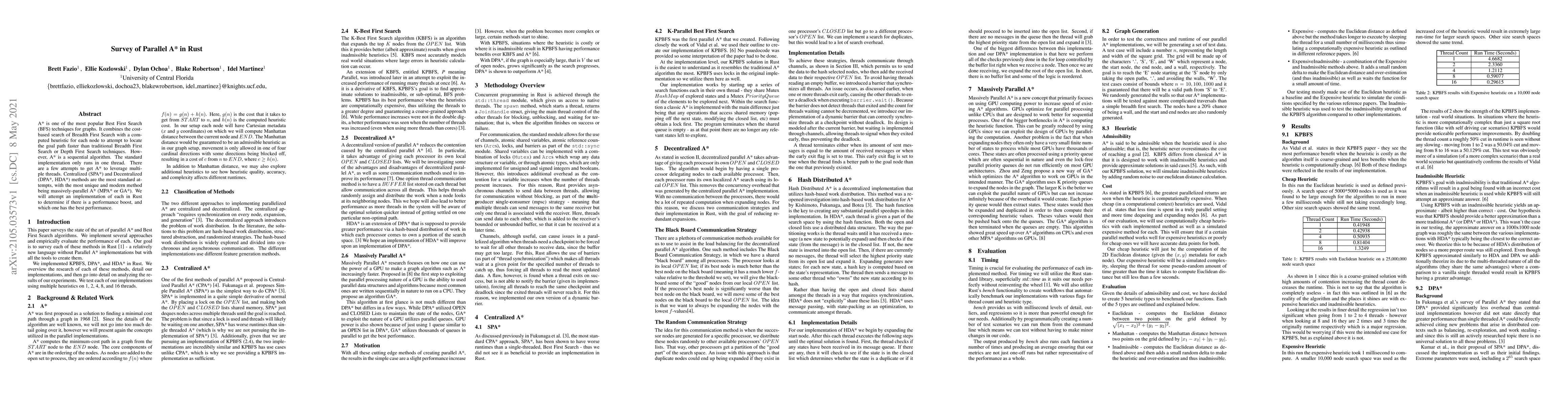 A* is one of the most popular Best First Search (BFS) techniques for graphs. It combines the cost-based search of Breadth First Search with a computed heuristic for each node to attempt to locate the goal path faster than traditional Breadth First Search or Depth First Search techniques. However, A* is a sequential algorithm. The standard implementation only runs in one thread. There are a few attempts to get A* to leverage multiple threads. Centralized (SPA*) and Decentralized (DPA*, HDA*) methods are the most standard attempts, with the most unique and modern method being massively-parallel A* (MPA* or GA*). We will attempt an implementation of each in Rust to determine if there is a performance boost, and which one has the best performance.