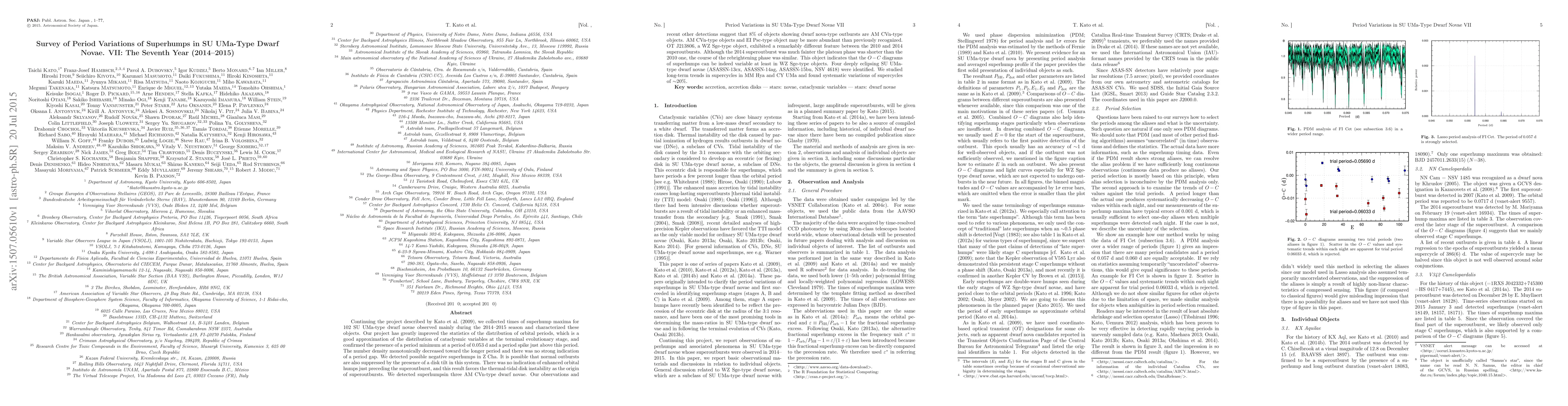A survey of 102 SU UMa-type dwarf novae observed between 2014-2015 revealed a period minimum at 0.053 days and no strong indication of a period gap, with superhumps detected in three AM CVn-type objects.
