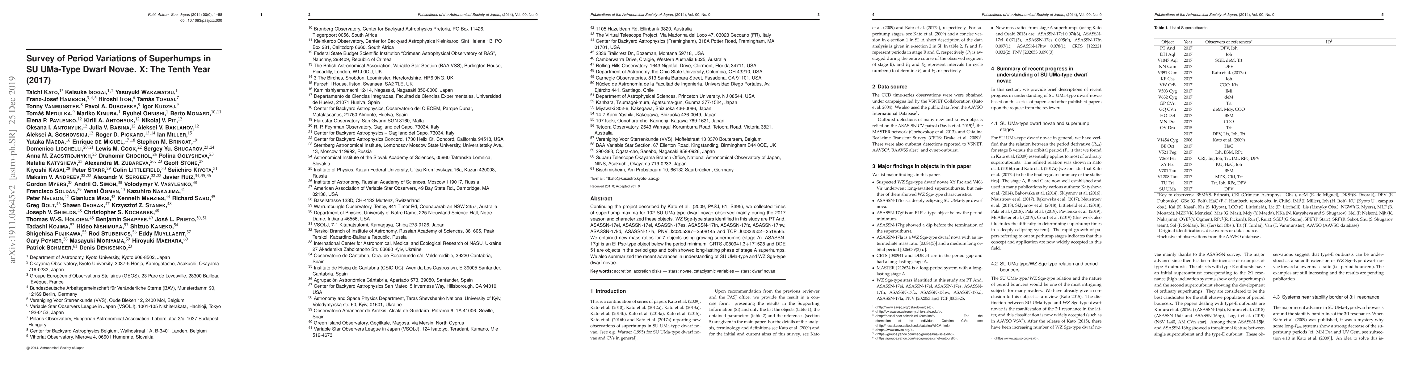 Continuing the project described by Kato et al. (2009, PASJ, 61, S395, arXiv/0905.1757), we collected times of superhump maxima for 102 SU UMa-type dwarf novae observed mainly during the 2017 season and characterized these objects. WZ Sge-type stars identified in this study are PT And, ASASSN-17ei, ASASSN-17el, ASASSN-17es, ASASSN-17fn, ASASSN-17fz, ASASSN-17hw, ASASSN-17kd, ASASSN-17la, PNV J20205397+2508145 and TCP J00332502-3518565. We obtained new mass ratios for 7 objects using growing superhumps (stage A). ASASSN-17gf is an EI Psc-type object below the period minimum. CRTS J080941.3+171528 and DDE 51 are objects in the period gap and both showed long-lasting phase of stage A superhumps. We also summarized the recent advances in understanding of SU UMa-type and WZ Sge-type dwarf novae.