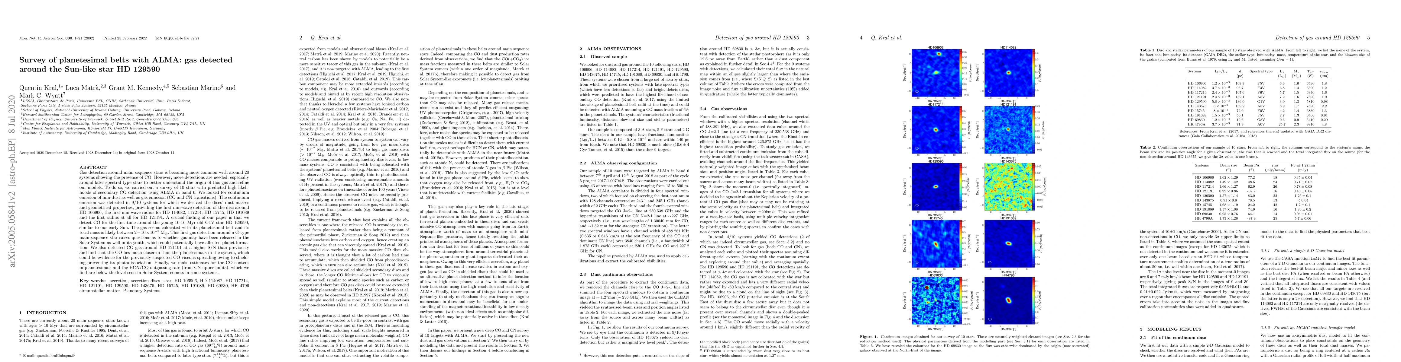 Gas detection around main sequence stars is becoming more common with around 20 systems showing the presence of CO. However, more detections are needed, especially around later spectral type stars to better understand the origin of this gas and refine our models. To do so, we carried out a survey of 10 stars with predicted high likelihoods of secondary CO detection using ALMA in band 6. We looked for continuum emission of mm-dust as well as gas emission (CO and CN transitions). The continuum emission was detected in 9/10 systems for which we derived the discs' dust masses and geometrical properties, providing the first mm-wave detection of the disc around HD 106906, the first mm-wave radius for HD 114082, 117214, HD 15745, HD 191089 and the first radius at all for HD 121191. A crucial finding of our paper is that we detect CO for the first time around the young 10-16 Myr old G1V star HD 129590, similar to our early Sun. The gas seems colocated with its planetesimal belt and its total mass is likely between $2-10 \times 10^{-5}$ M$_\oplus$. This first gas detection around a G-type main-sequence star raises questions as to whether gas may have been released in the Solar System as well in its youth, which could potentially have affected planet formation. We also detected CO gas around HD 121191 at a higher S/N than previously and find that the CO lies much closer-in than the planetesimals in the system, which could be evidence for the previously suspected CO viscous spreading owing to shielding preventing its photodissociation. Finally, we make estimates for the CO content in planetesimals and the HCN/CO outgassing rate (from CN upper limits), which we find are below the level seen in Solar System comets in some systems.