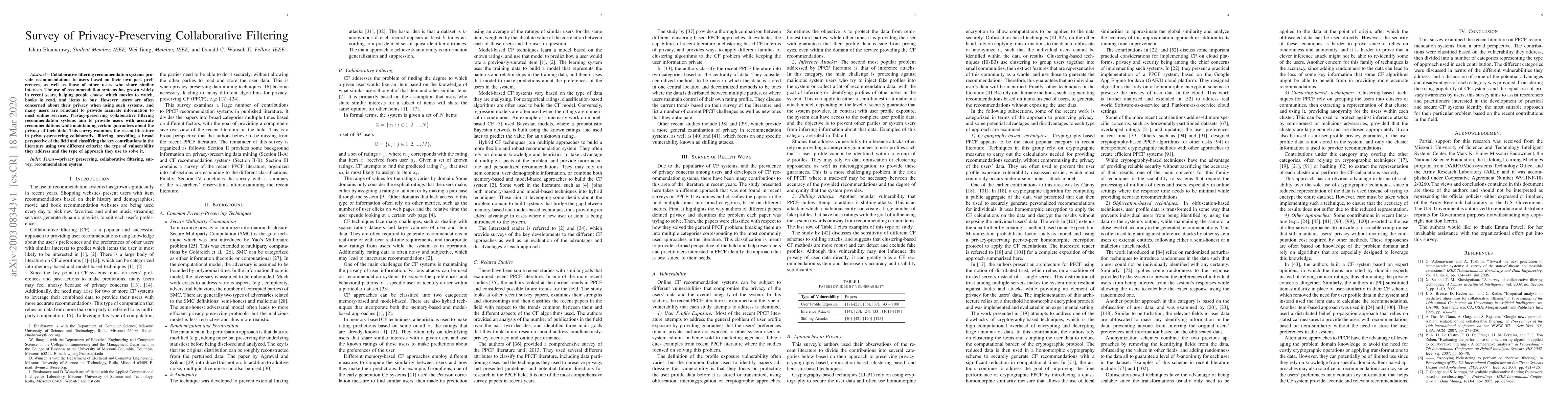 This survey explores privacy-preserving collaborative filtering techniques that aim to provide accurate recommendations while safeguarding user data privacy. It categorizes recent literature based on vulnerabilities addressed and the approaches used to mitigate them.