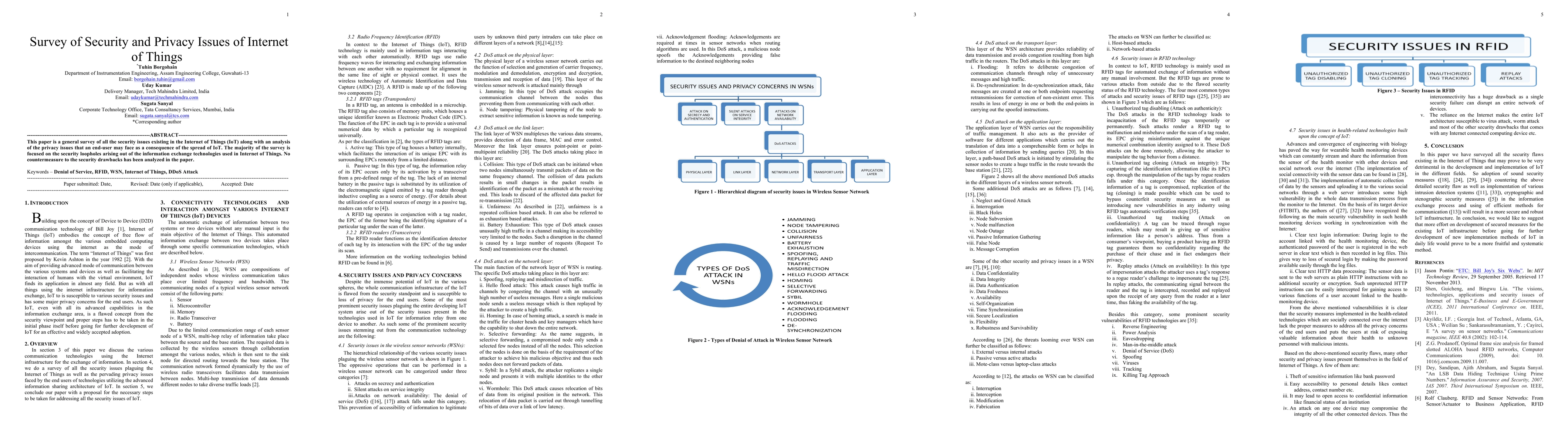 This paper is a general survey of all the security issues existing in the Internet of Things (IoT) along with an analysis of the privacy issues that an end-user may face as a consequence of the spread of IoT. The majority of the survey is focused on the security loopholes arising out of the information exchange technologies used in Internet of Things. No countermeasure to the security drawbacks has been analyzed in the paper.