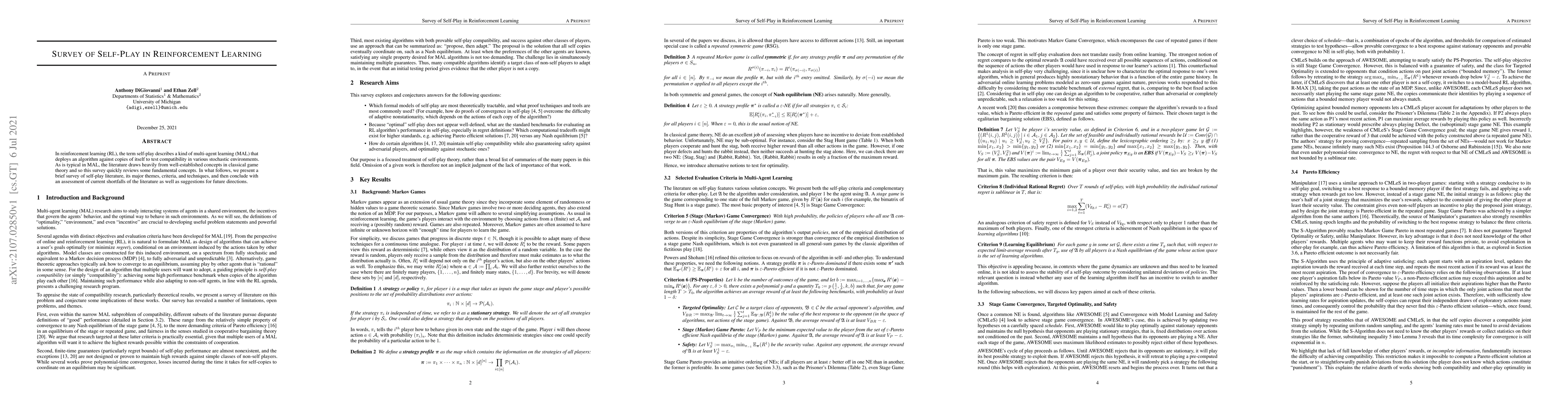 This paper surveys self-play in reinforcement learning, detailing its multi-agent learning applications and drawing from classical game theory. It reviews major themes, criteria, and techniques, concluding with an evaluation of current limitations and future research directions.