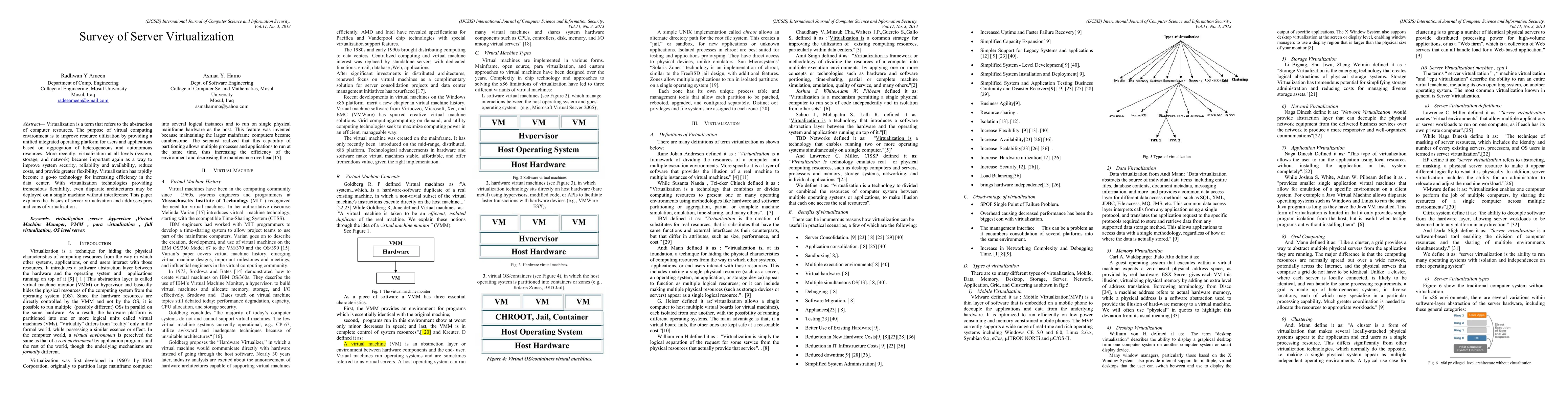 This paper surveys server virtualization, explaining its role in abstracting computer resources and improving resource utilization. It discusses the benefits of virtualization, including enhanced security, reliability, and cost-efficiency, alongside its challenges and limitations.