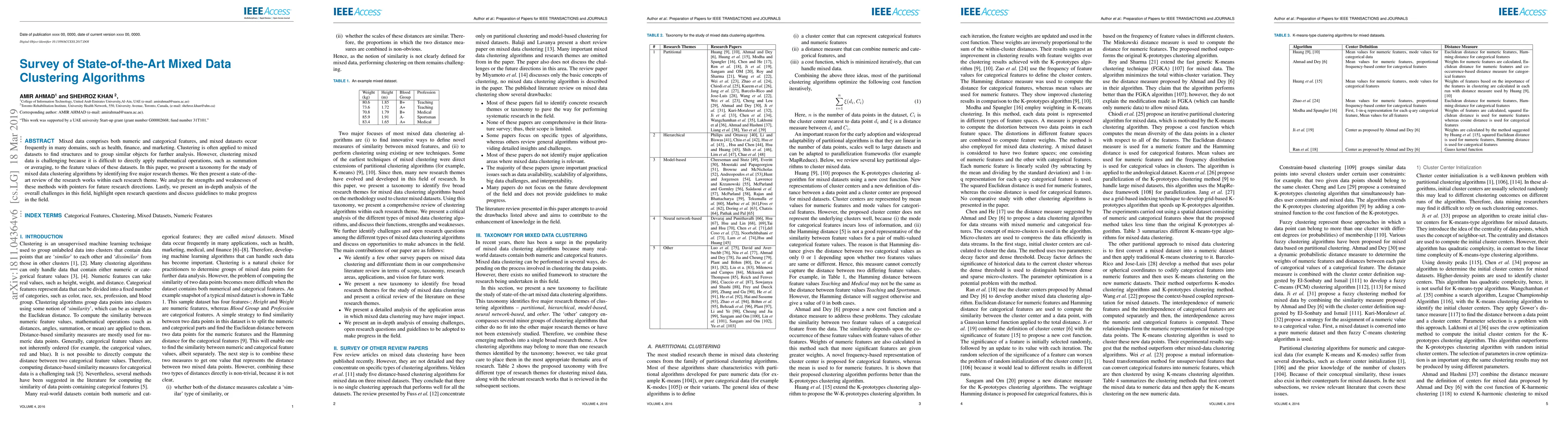 Mixed data comprises both numeric and categorical features, and mixed datasets occur frequently in many domains, such as health, finance, and marketing. Clustering is often applied to mixed datasets to find structures and to group similar objects for further analysis. However, clustering mixed data is challenging because it is difficult to directly apply mathematical operations, such as summation or averaging, to the feature values of these datasets. In this paper, we present a taxonomy for the study of mixed data clustering algorithms by identifying five major research themes. We then present a state-of-the-art review of the research works within each research theme. We analyze the strengths and weaknesses of these methods with pointers for future research directions. Lastly, we present an in-depth analysis of the overall challenges in this field, highlight open research questions and discuss guidelines to make progress in the field.