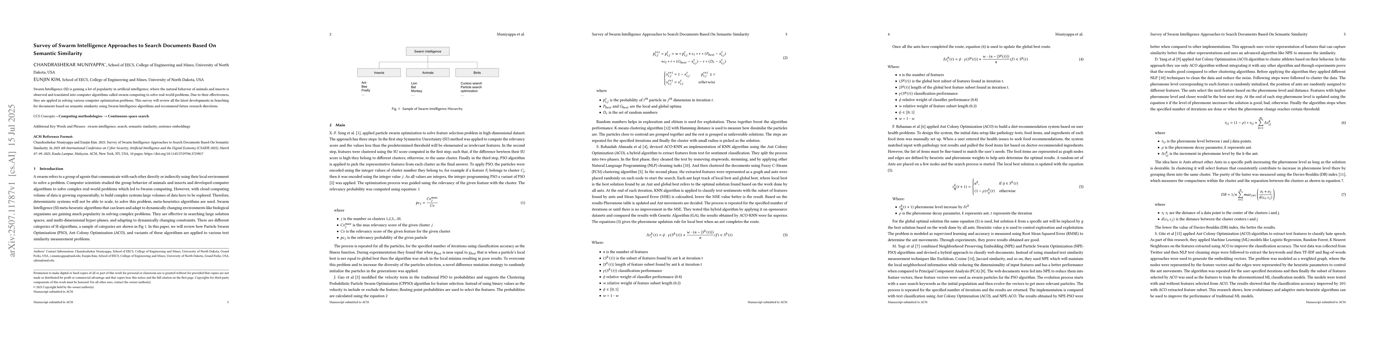 Swarm Intelligence (SI) is gaining a lot of popularity in artificial intelligence, where the natural behavior of animals and insects is observed and translated into computer algorithms called swarm computing to solve real-world problems. Due to their effectiveness, they are applied in solving various computer optimization problems. This survey will review all the latest developments in Searching for documents based on semantic similarity using Swarm Intelligence algorithms and recommend future research directions.