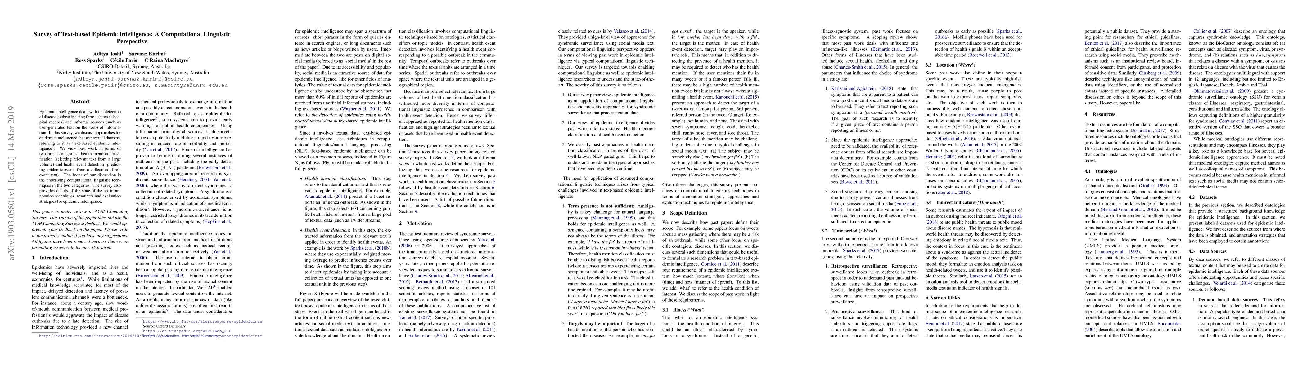 This paper surveys text-based epidemic intelligence, focusing on computational linguistic techniques for health mention classification and health event detection from textual datasets. It reviews state-of-the-art annotation techniques, resources, and evaluation strategies for this domain.