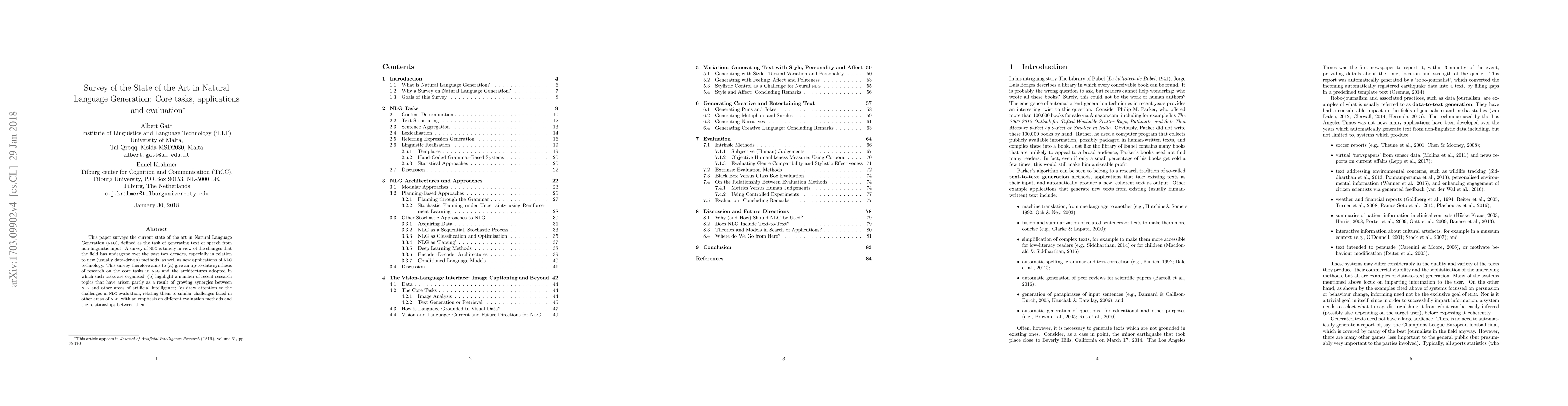 This paper surveys the current state of the art in Natural Language Generation (NLG), defined as the task of generating text or speech from non-linguistic input. A survey of NLG is timely in view of the changes that the field has undergone over the past decade or so, especially in relation to new (usually data-driven) methods, as well as new applications of NLG technology. This survey therefore aims to (a) give an up-to-date synthesis of research on the core tasks in NLG and the architectures adopted in which such tasks are organised; (b) highlight a number of relatively recent research topics that have arisen partly as a result of growing synergies between NLG and other areas of artificial intelligence; (c) draw attention to the challenges in NLG evaluation, relating them to similar challenges faced in other areas of Natural Language Processing, with an emphasis on different evaluation methods and the relationships between them.