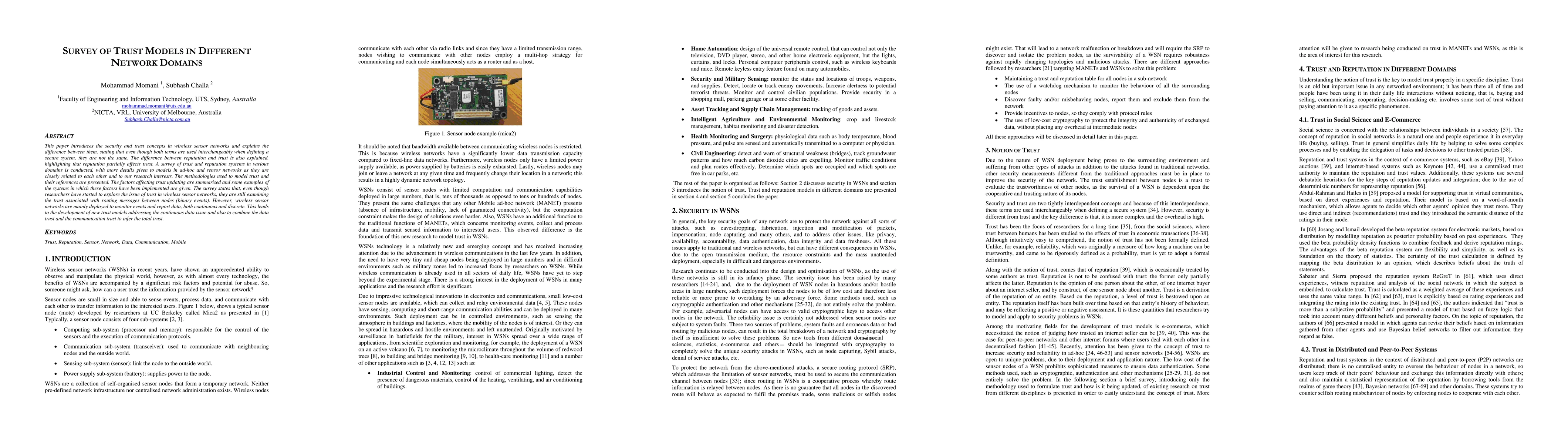 This paper surveys trust models in various network domains, emphasizing the distinction between security and trust, particularly in wireless sensor networks. It highlights the need for new trust models to address continuous data monitoring and the integration of data and communication trust.