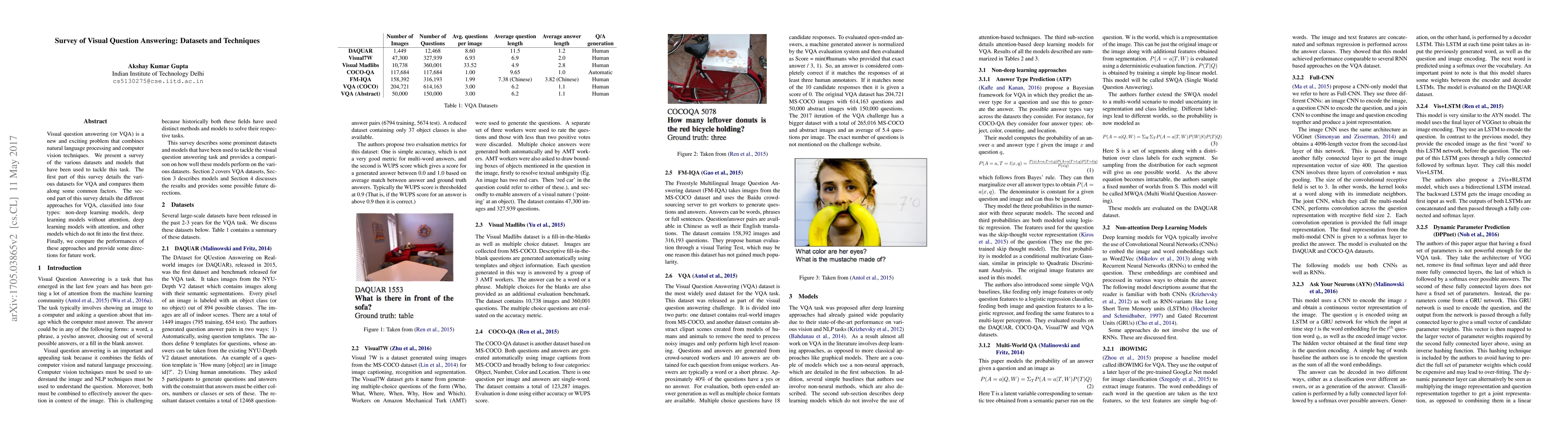 This survey reviews visual question answering (VQA) datasets, comparing them based on common factors, and categorizes VQA techniques into non-deep learning, deep learning without attention, deep learning with attention, and miscellaneous models. It also evaluates their performance and suggests future research directions.