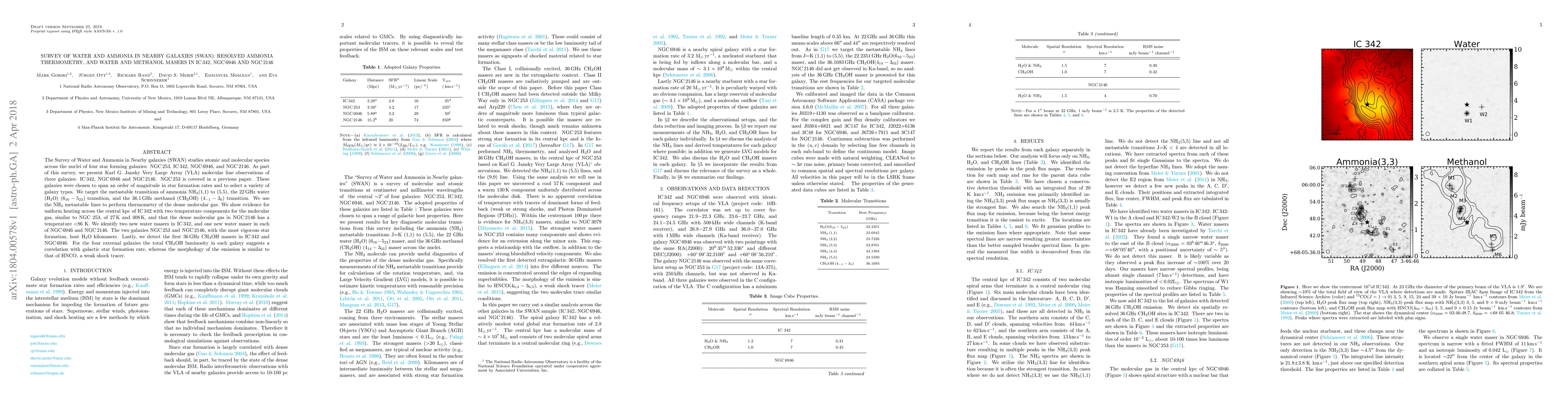 The SWAN survey investigates ammonia and water masers in three star-forming galaxies (IC 342, NGC 6946, and NGC 2146). The study reveals uniform heating across IC 342, identifies new water masers, and finds a correlation between methanol luminosity and star formation rate.