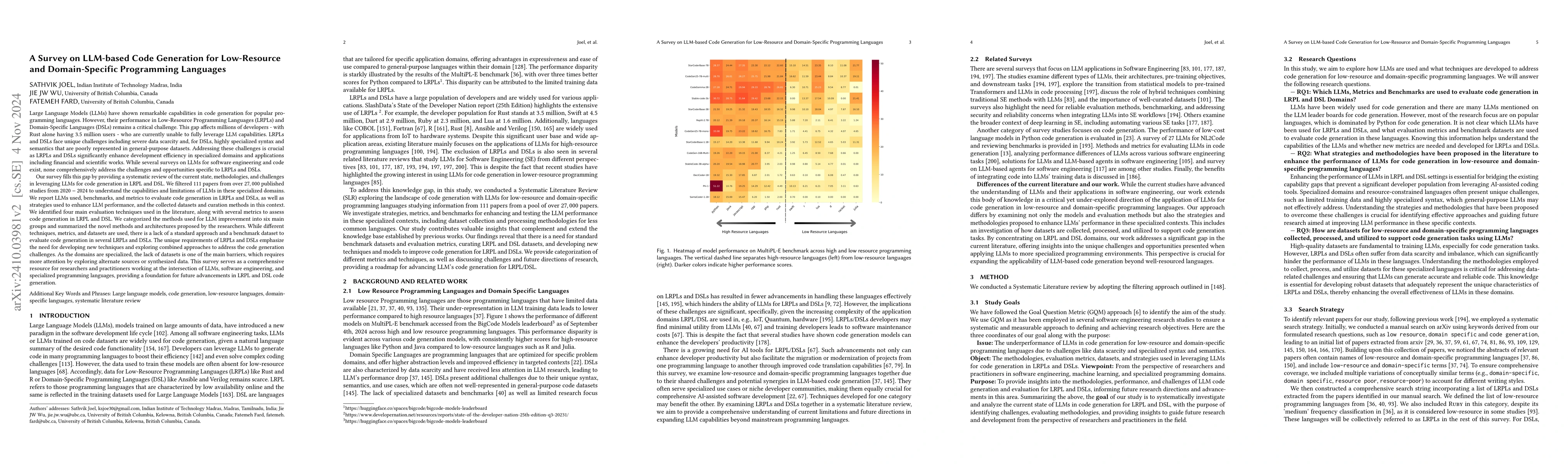 This survey examines the challenges and methodologies in leveraging Large Language Models (LLMs) for code generation in Low-Resource Programming Languages (LRPLs) and Domain-Specific Languages (DSLs). It systematically reviews current research, identifies evaluation techniques, and proposes areas for future improvement, highlighting the lack of standardized benchmarks and datasets.