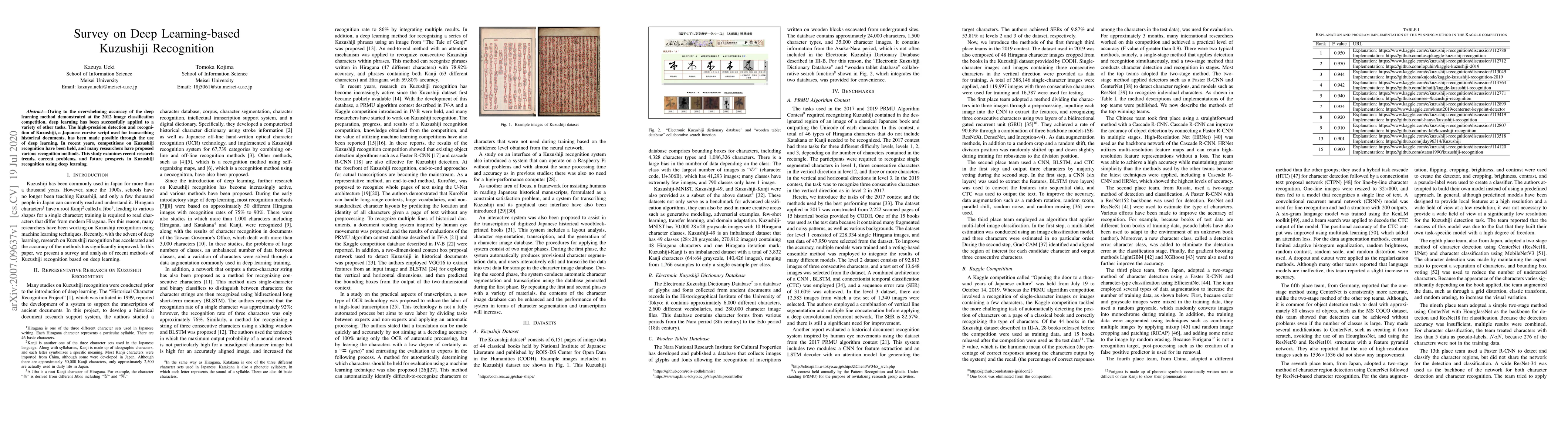 Owing to the overwhelming accuracy of the deep learning method demonstrated at the 2012 image classification competition, deep learning has been successfully applied to a variety of other tasks. The high-precision detection and recognition of Kuzushiji, a Japanese cursive script used for transcribing historical documents, has been made possible through the use of deep learning. In recent years, competitions on Kuzushiji recognition have been held, and many researchers have proposed various recognition methods. This study examines recent research trends, current problems, and future prospects in Kuzushiji recognition using deep learning.