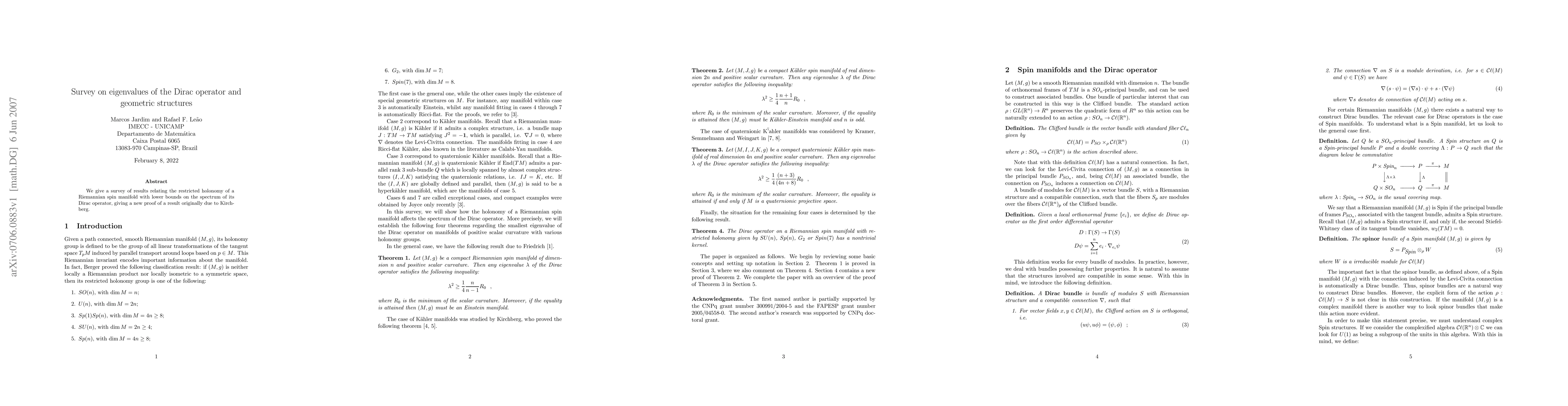 This paper surveys results linking the Dirac operator's eigenvalues to geometric structures of spin manifolds, providing a new proof for Kirchberg's result on lower bounds for spectral growth.