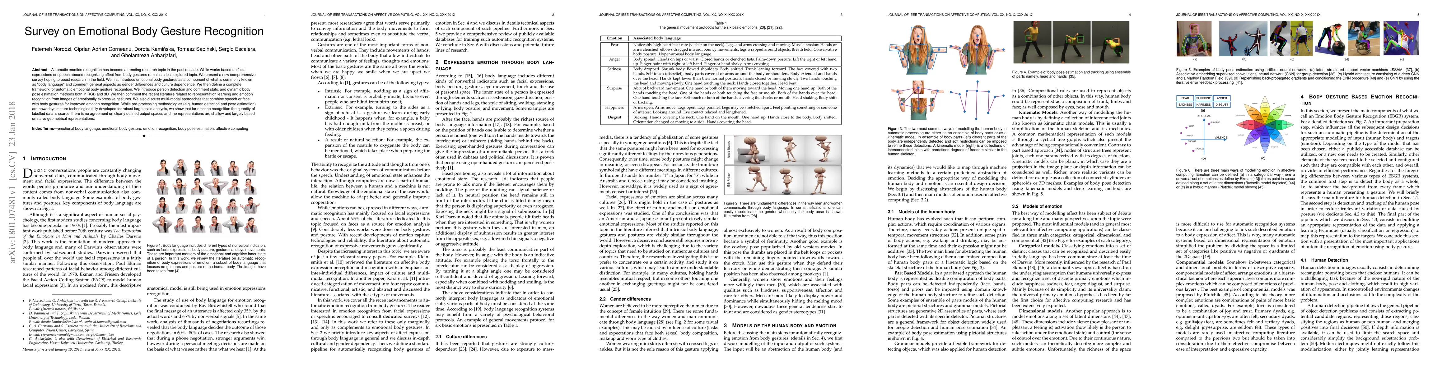 This survey explores the under-researched area of automatic emotional body gesture recognition, highlighting the challenges such as limited labeled data and shallow representations. It provides a comprehensive framework covering person detection, pose estimation, and multi-modal approaches to enhance emotion recognition.