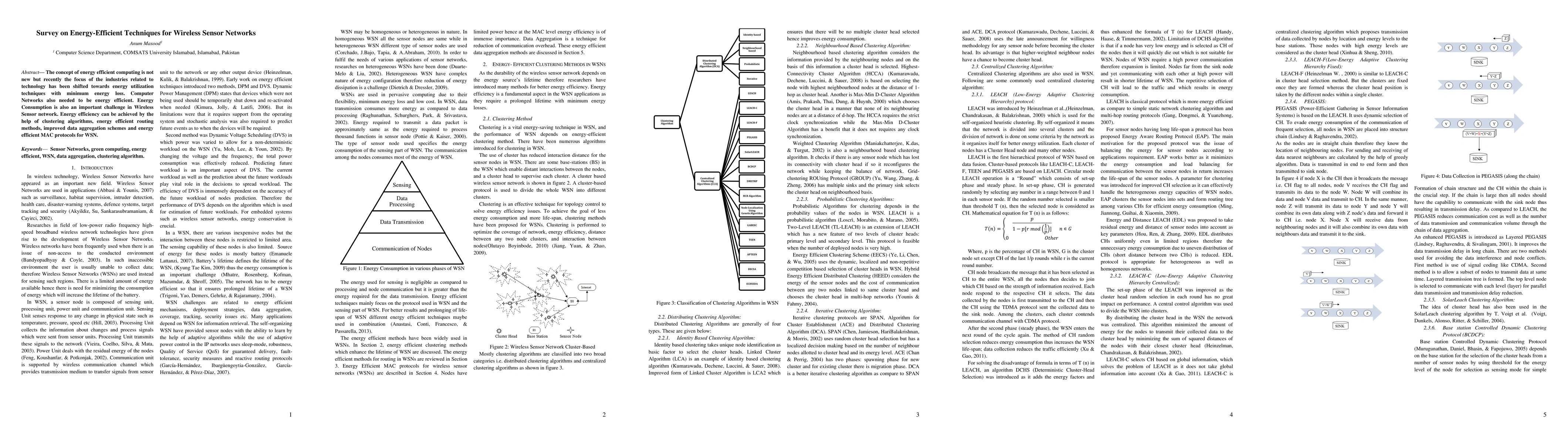 This paper explores various energy-efficient techniques for wireless sensor networks to minimize energy loss and optimize performance. It highlights the importance of clustering algorithms, routing methods, data aggregation schemes, and MAC protocols in achieving energy efficiency.