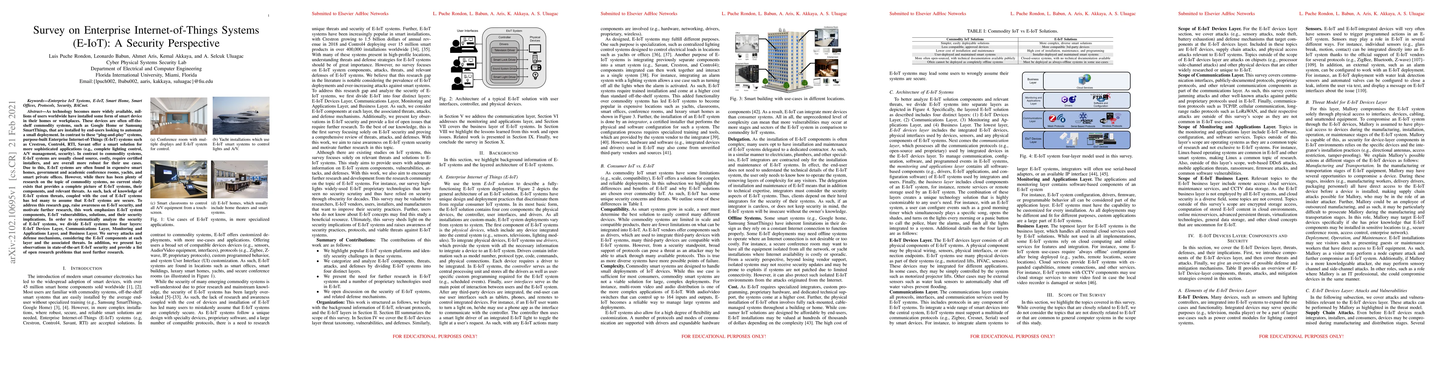 As technology becomes more widely available, millions of users worldwide have installed some form of smart device in their homes or workplaces. These devices are often off-the-shelf commodity systems, such as Google Home or Samsung SmartThings, that are installed by end-users looking to automate a small deployment. In contrast to these "plug-and-play" systems, purpose-built Enterprise Internet-of-Things (E-IoT) systems such as Crestron, Control4, RTI, Savant offer a smart solution for more sophisticated applications (e.g., complete lighting control, A/V management, security). In contrast to commodity systems, E-IoT systems are usually closed source, costly, require certified installers, and are overall more robust for their use cases. Due to this, E-IoT systems are often found in expensive smart homes, government and academic conference rooms, yachts, and smart private offices. However, while there has been plenty of research on the topic of commodity systems, no current study exists that provides a complete picture of E-IoT systems, their components, and relevant threats. As such, lack of knowledge of E-IoT system threats, coupled with the cost of E-IoT systems has led many to assume that E-IoT systems are secure. To address this research gap, raise awareness on E-IoT security, and motivate further research, this work emphasizes E-IoT system components, E-IoT vulnerabilities, solutions, and their security implications. In order to systematically analyze the security of E-IoT systems, we divide E-IoT systems into four layers: E-IoT Devices Layer, Communications Layer, Monitoring and Applications Layer, and Business Layer. We survey attacks and defense mechanisms, considering the E-IoT components at each layer and the associated threats. In addition, we present key observations in state-of-the-art E-IoT security and provide a list of open research problems that need further research.