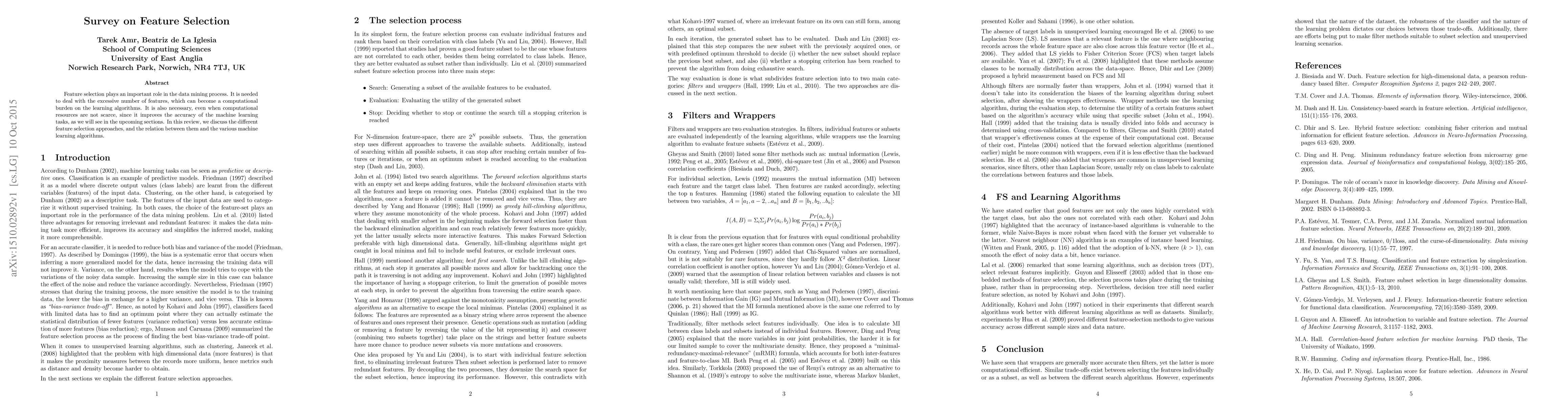 Feature selection plays an important role in the data mining process. It is needed to deal with the excessive number of features, which can become a computational burden on the learning algorithms. It is also necessary, even when computational resources are not scarce, since it improves the accuracy of the machine learning tasks, as we will see in the upcoming sections. In this review, we discuss the different feature selection approaches, and the relation between them and the various machine learning algorithms.