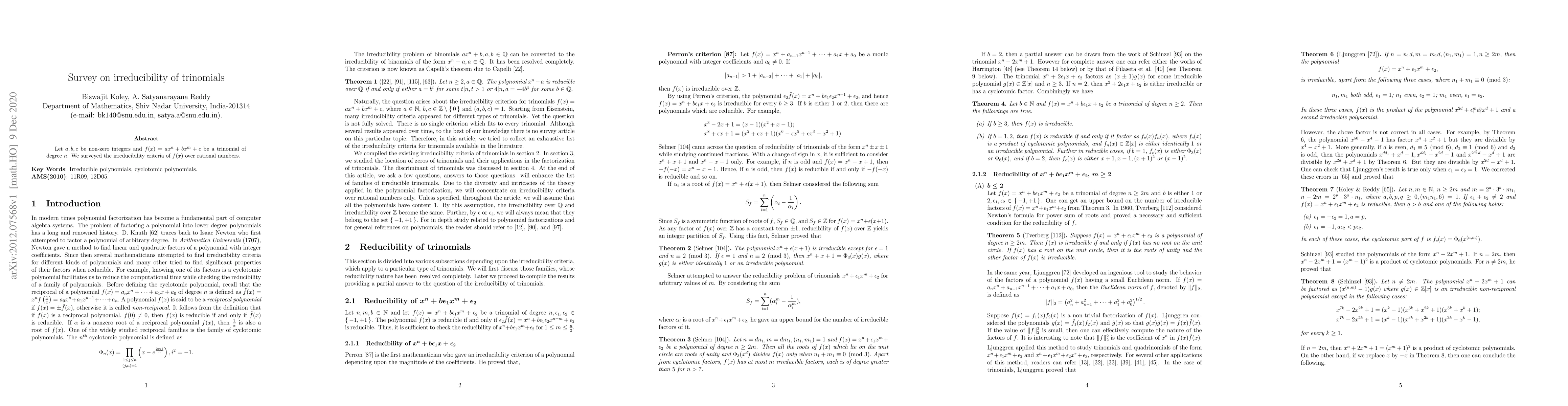 This paper surveys criteria for determining the irreducibility of trinomials of the form $f(x) = ax^n + bx^m + c$ over the rational numbers, where $a$, $b$, and $c$ are non-zero integers. The study focuses on various mathematical approaches to assess the polynomial's indivisibility.