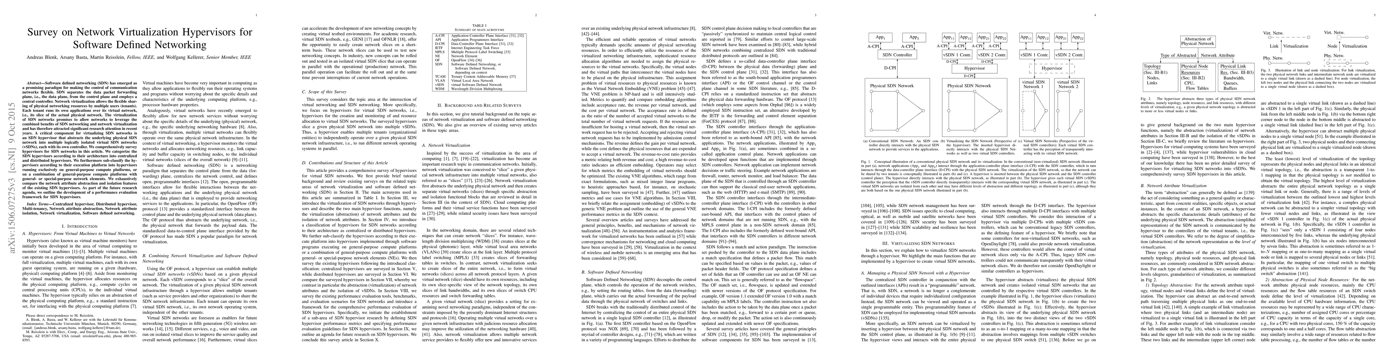 This paper surveys hypervisors for virtualizing software defined networking (SDN) by categorizing them based on architecture and execution platform. It compares their network abstraction and isolation features and proposes a framework for future performance evaluation.