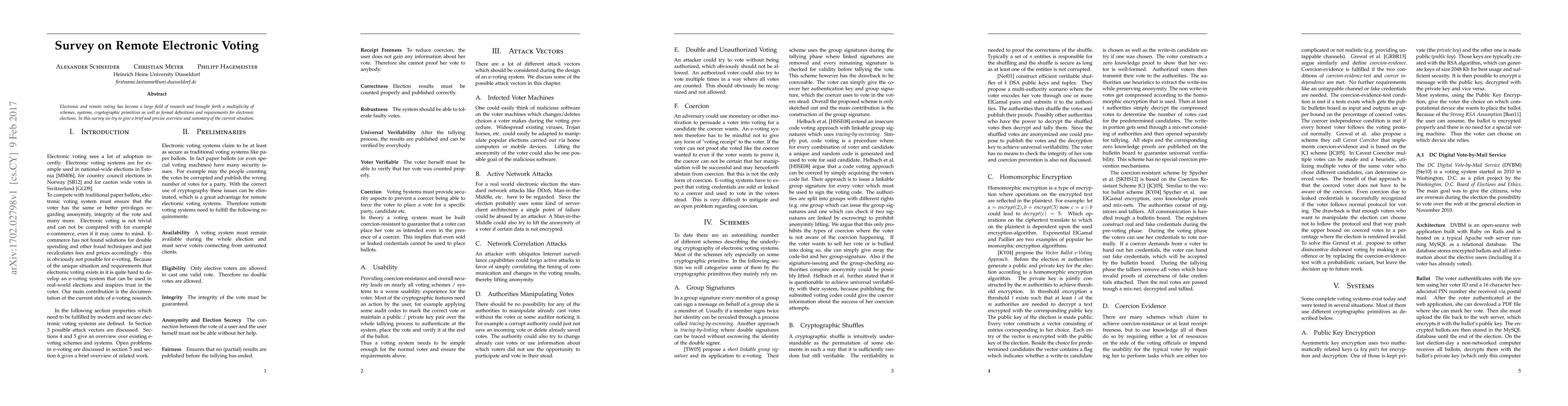 This survey provides a concise overview of the current state of remote electronic voting, summarizing various schemes, systems, cryptographic methods, and formal requirements that underpin electronic election processes. It aims to present a clear and precise summary of the field's advancements.