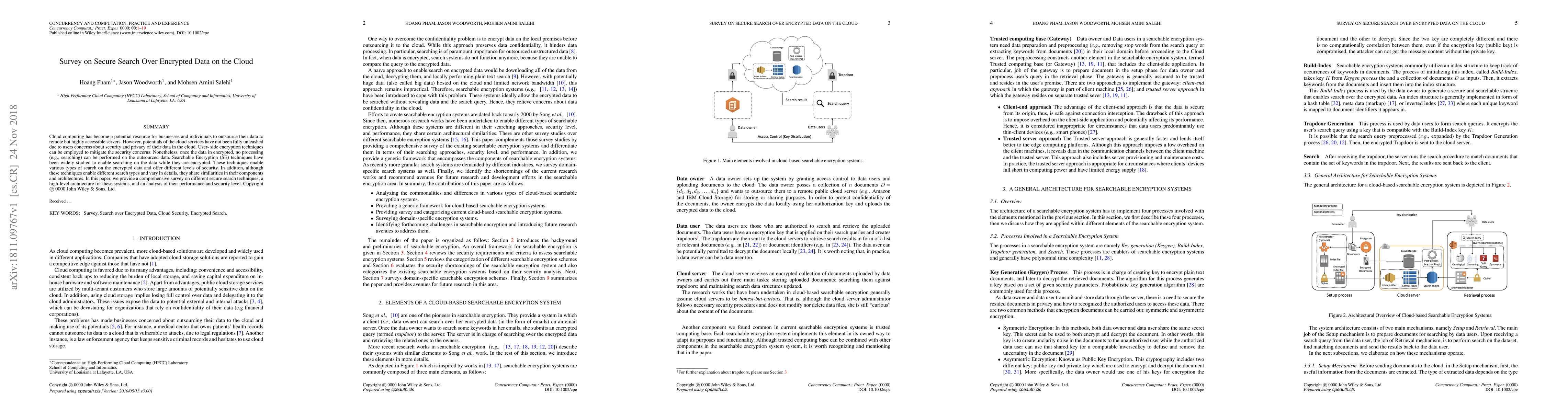 This paper surveys secure search techniques over encrypted data in cloud environments, focusing on their architecture, performance, and security levels. It aims to address privacy concerns by enabling searches on encrypted data while maintaining security.