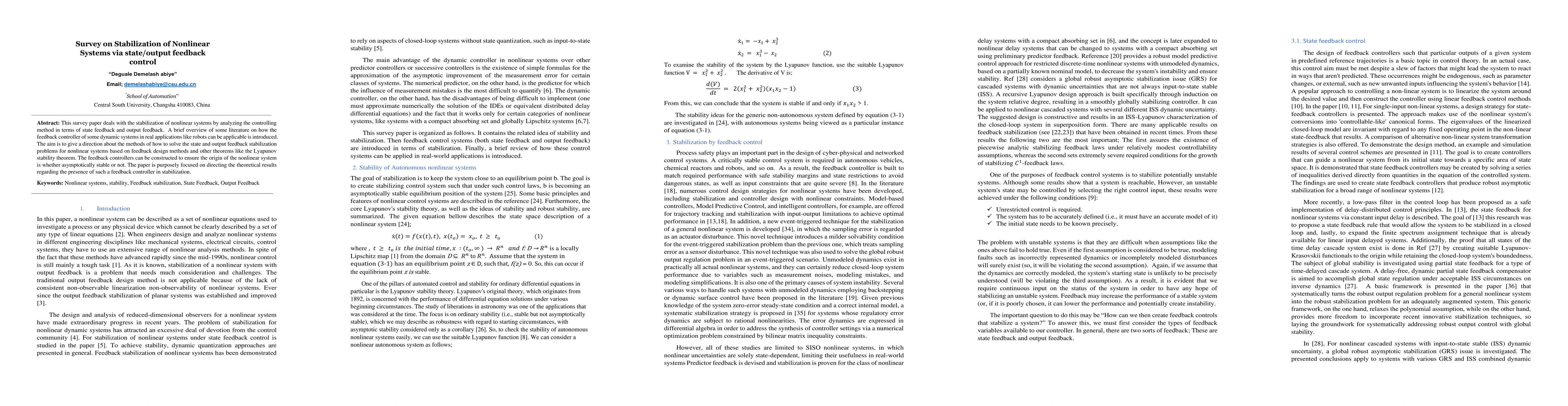 This survey paper explores the stabilization of nonlinear systems using state and output feedback control methods, emphasizing theoretical results and practical applications like robotics. It focuses on the application of feedback design and Lyapunov stability theorems to ensure the stability of the system's origin.