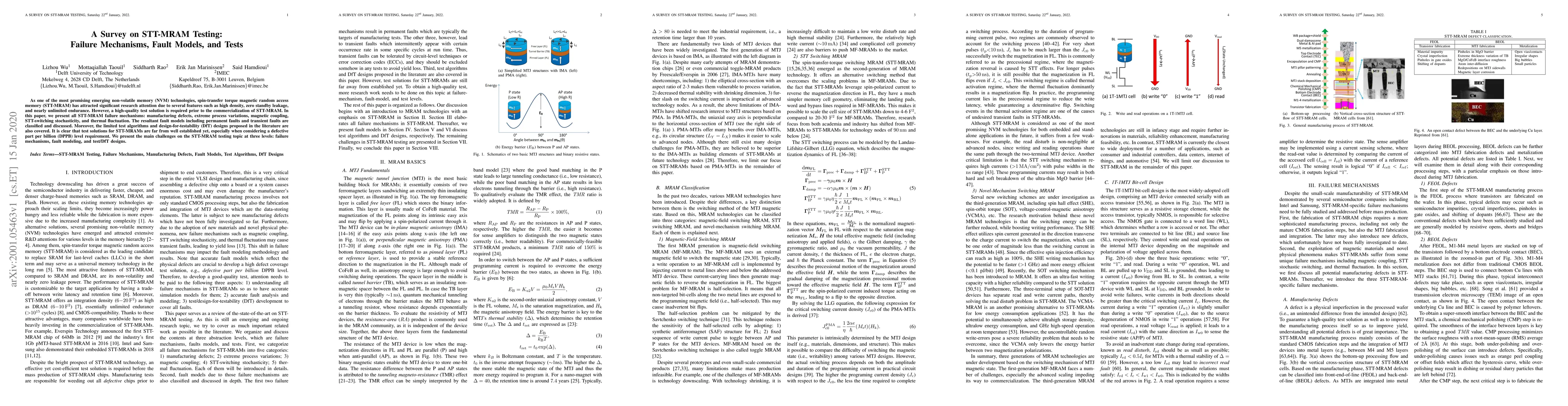 This paper surveys the testing challenges for STT-MRAM, including failure mechanisms like manufacturing defects and thermal fluctuations, and discusses various fault models and limited test algorithms. It highlights the need for improved test solutions to meet stringent defective part per billion requirements.