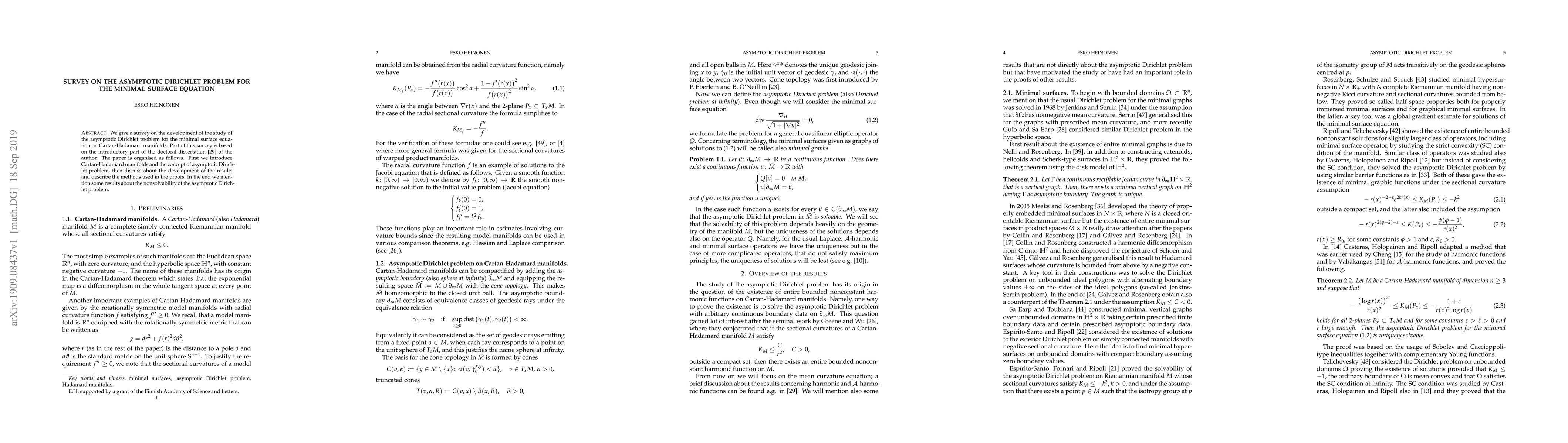 This survey explores the progress in studying the asymptotic Dirichlet problem for the minimal surface equation on Cartan-Hadamard manifolds, detailing the development of results and methods used, and concluding with insights on the nonsolvability of the problem. It is partly based on the author's doctoral dissertation.