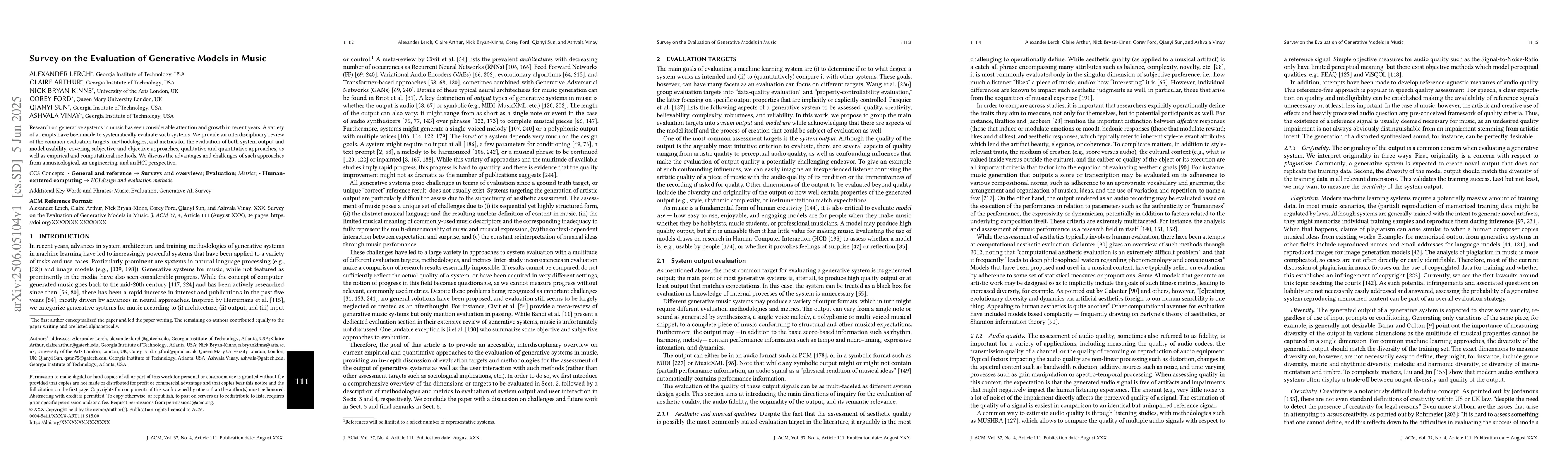 The paper presents an interdisciplinary review of evaluation targets, methodologies, and metrics for generative music systems, covering subjective and objective, qualitative and quantitative, and empirical and computational approaches.