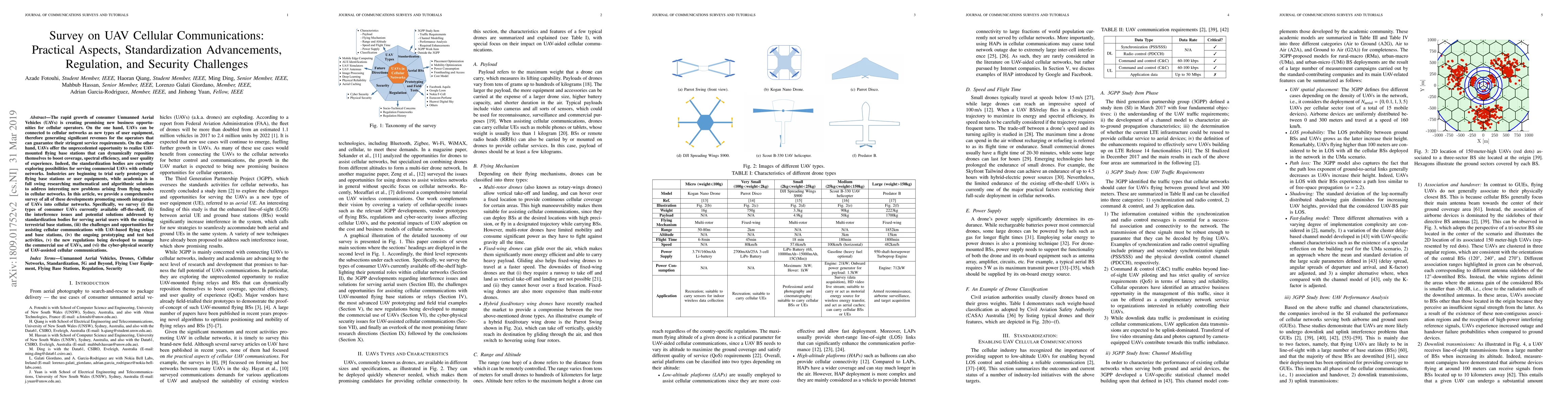 This paper provides a comprehensive survey on integrating Unmanned Aerial Vehicles (UAVs) into cellular networks, covering consumer UAV types, interference issues, standardization efforts, UAV-based flying relays, ongoing prototyping, regulatory developments, and security challenges. It highlights the potential for UAVs to enhance network coverage and user experience while addressing associated regulatory and security concerns.