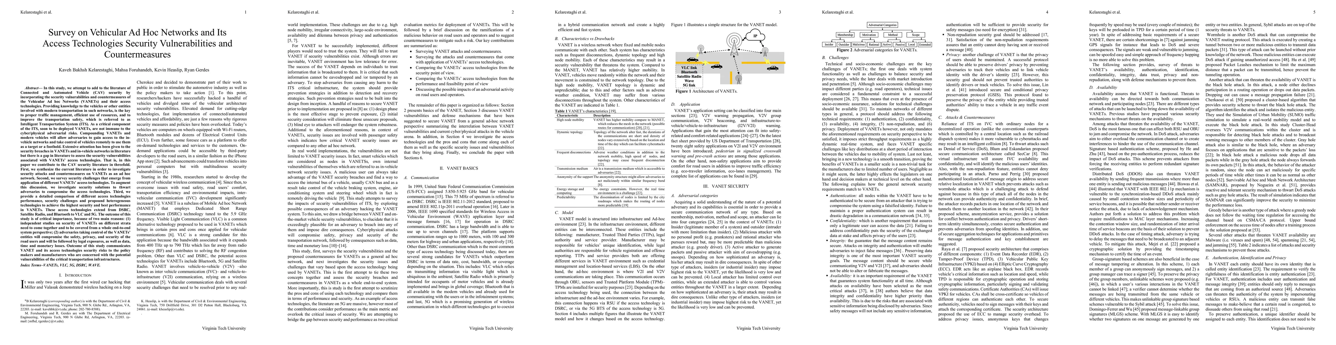 In this study, we attempt to add to the literature of Connected and Automated Vehicle (CAV) security by incorporating the security vulnerabilities and countermeasures of the Vehicular Ad hoc Networks (VANETs) and their access technologies. Compounding VANETs and modern vehicles will allow adversaries to gain access to the in-vehicle networks and take control of vehicles remotely to use them as a target or a foothold. Extensive attention has been given to the security breaches in VANETs and in-vehicle networks in literature but there is a gap in literature to assess the security vulnerabilities associated with VANETs access technologies. That is, in this paper we contribute to the CAV security literature in threefold. First, we synthesize the current literature in order to investigate security attacks and countermeasures on VANETs as an ad hoc network. Second, we survey security challenges that emerge from application of different VANETs access technologies. To augment this discussion, we investigate security solutions to thwart adversaries to compromise the access technologies. Third, we provide a detailed comparison of different access technologies performance, security challenges and propound heterogeneous technologies to achieve the highest security and best performance in VANETs. These access technologies extend from DSRC, Satellite Radio, and Bluetooth to VLC and 5G. The outcome of this study is of critical importance, because of two main reasons: (1) independent studies on security of VANETs on different strata need to come together and to be covered from a whole end-to-end system perspective, (2) adversaries taking control of the VANETs entities will compromise the safety, privacy, and security of the road users and will be followed by legal exposures, as well as data, time and monetary losses.