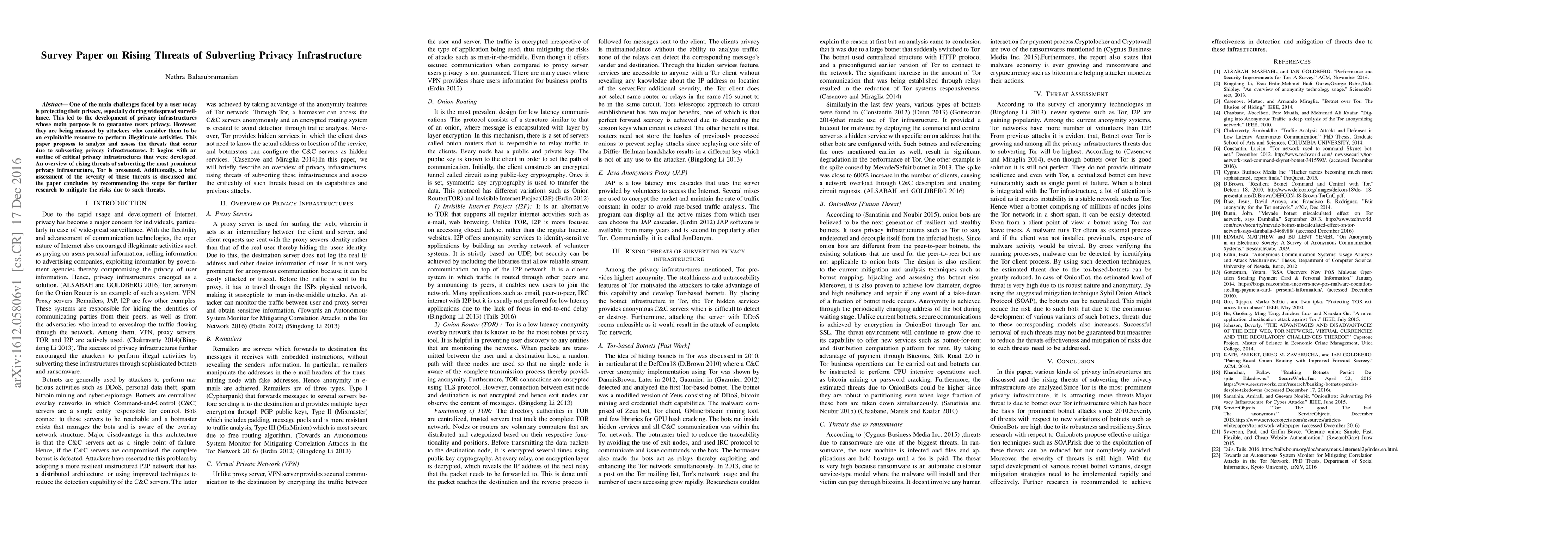 This paper surveys the rising threats of subverting privacy infrastructures, focusing on the misuse of systems like Tor for illegitimate activities. It outlines the critical privacy infrastructures and assesses the severity of these threats, concluding with recommendations for further research to mitigate such risks.