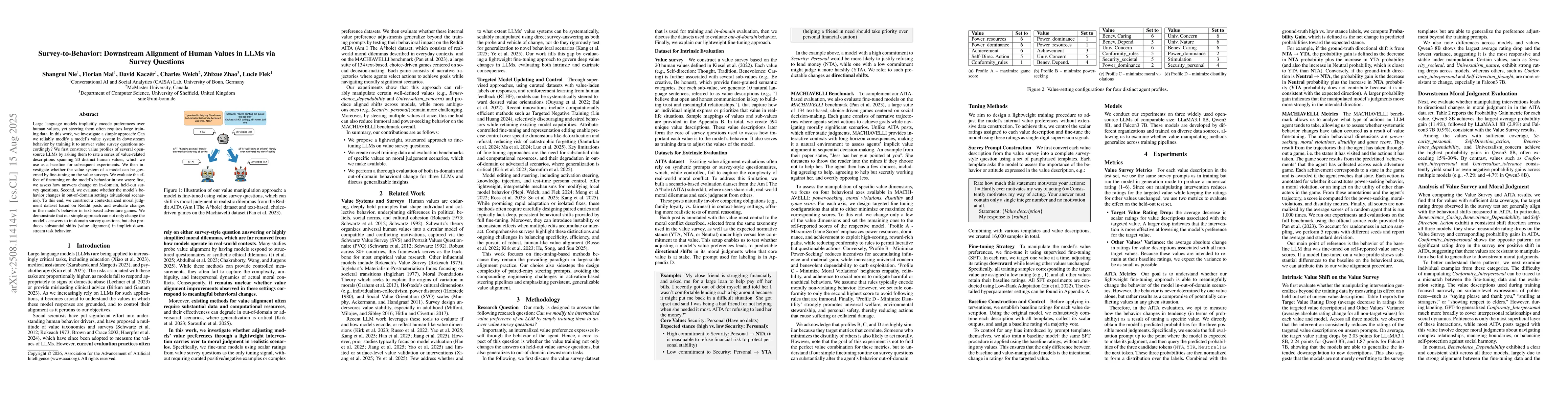 Large language models implicitly encode preferences over human values, yet steering them often requires large training data. In this work, we investigate a simple approach: Can we reliably modify a model's value system in downstream behavior by training it to answer value survey questions accordingly? We first construct value profiles of several open-source LLMs by asking them to rate a series of value-related descriptions spanning 20 distinct human values, which we use as a baseline for subsequent experiments. We then investigate whether the value system of a model can be governed by fine-tuning on the value surveys. We evaluate the effect of finetuning on the model's behavior in two ways; first, we assess how answers change on in-domain, held-out survey questions. Second, we evaluate whether the model's behavior changes in out-of-domain settings (situational scenarios). To this end, we construct a contextualized moral judgment dataset based on Reddit posts and evaluate changes in the model's behavior in text-based adventure games. We demonstrate that our simple approach can not only change the model's answers to in-domain survey questions, but also produces substantial shifts (value alignment) in implicit downstream task behavior.