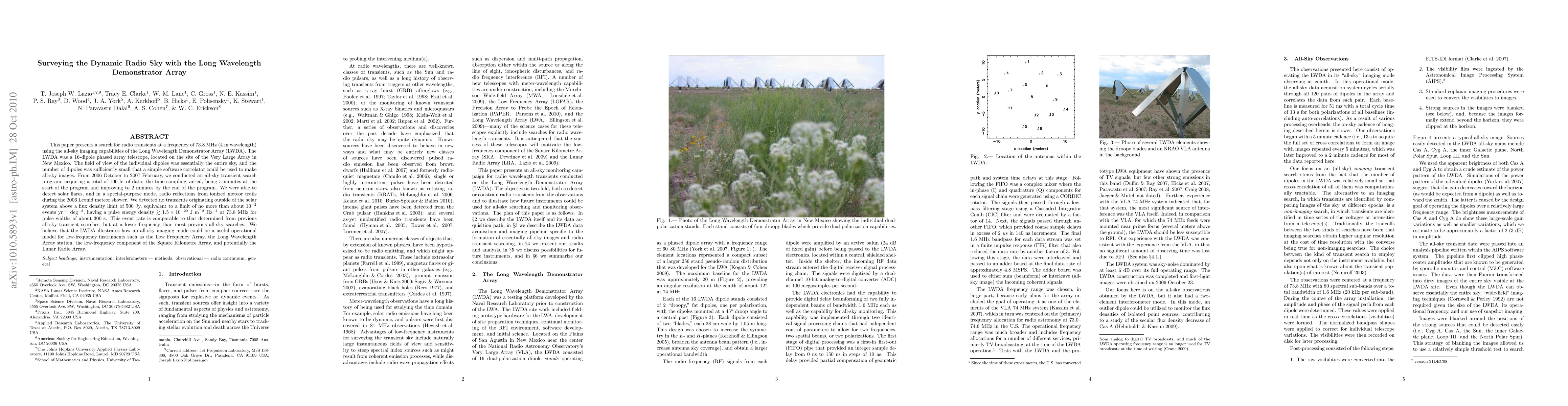 This paper reports on the use of the Long Wavelength Demonstrator Array (LWDA) to search for radio transients at 73.8 MHz, detecting solar flares and meteor reflections but finding no extra-solar transients above a certain flux density limit. The study suggests that all-sky imaging could be a viable operational model for future low-frequency radio telescopes.