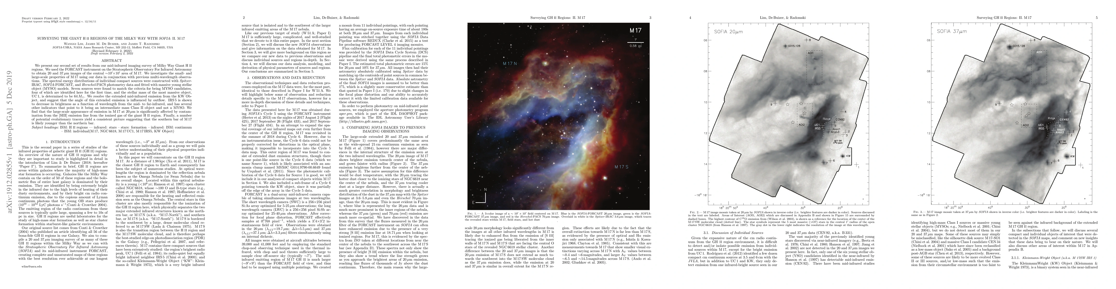 We present our second set of results from our mid-infrared imaging survey of Milky Way Giant HII regions. We used the FORCAST instrument on the Stratospheric Observatory For Infrared Astronomy to obtain 20 and 37$\mu$m images of the central ~10'X10' area of M17. We investigate the small- and large-scale properties of M17 using our data in conjunction with previous multi-wavelength observations. The spectral energy distributions of individual compact sources were constructed with Spitzer-IRAC, SOFIA-FORCAST, and Herschel-PACS photometry data and fitted with massive young stellar object (MYSO) models. Seven sources were found to match the criteria for being MYSO candidates, four of which are identified here for the first time, and the stellar mass of the most massive object, UC1, is determined to be 64 solar mass. We resolve the extended mid-infrared emission from the KW Object, and suggest that the angle of this extended emission is influenced by outflow. IRS5 is shown to decrease in brightness as a function of wavelength from the mid- to far-infrared, and has several other indicators that point to it being an intermediate mass Class II object and not a MYSO. We find that the large-scale appearance of emission in M17 at 20$\mu$m is significantly affected by contamination from the [SIII] emission line from the ionized gas of the Giant HII region. Finally, a number of potential evolutionary tracers yield a consistent picture suggesting that the southern bar of M17 is likely younger than the northern bar.