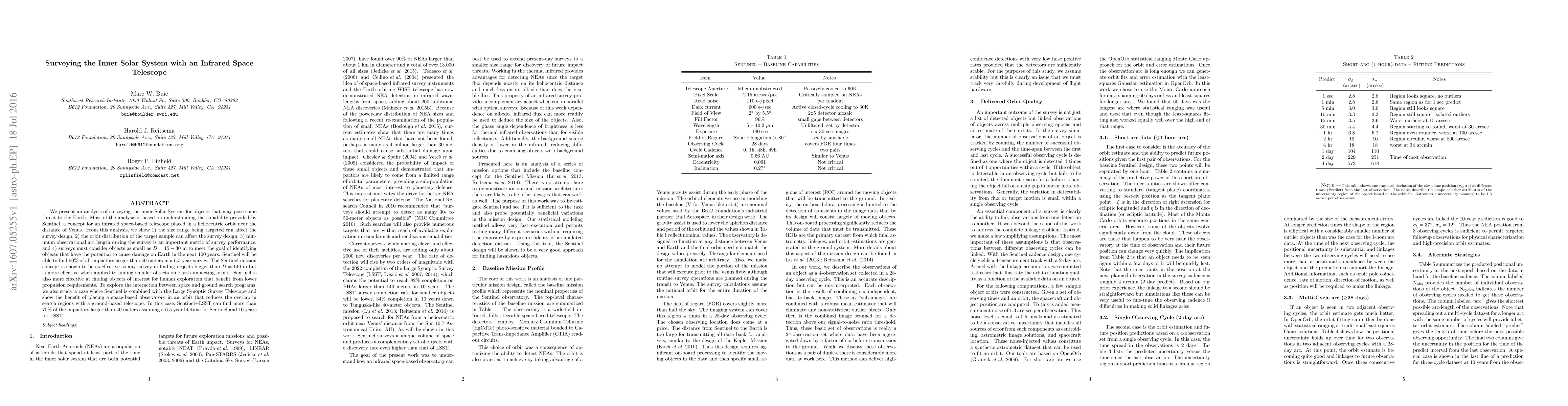 We present an analysis of surveying the inner Solar System for objects that may pose some threat to the Earth. Most of the analysis is based on understanding the capability provided by Sentinel, a concept for an infrared space-based telescope placed in a heliocentric orbit near the distance of Venus. From this analysis, we show 1) the size range being targeted can affect the survey design, 2) the orbit distribution of the target sample can affect the survey design, 3) minimum observational arc length during the survey is an important metric of survey performance, and 4) surveys must consider objects as small as D=15-30 m to meet the goal of identifying objects that have the potential to cause damage on Earth in the next 100 years. Sentinel will be able to find 50% of all impactors larger than 40 meters in a 6.5 year survey. The Sentinel mission concept is shown to be as effective as any survey in finding objects bigger than D=140 m but is more effective when applied to finding smaller objects on Earth-impacting orbits. Sentinel is also more effective at finding objects of interest for human exploration that benefit from lower propulsion requirements. To explore the interaction between space and ground search programs, we also study a case where Sentinel is combined with the Large Synoptic Survey Telescope and show the benefit of placing a space-based observatory in an orbit that reduces the overlap in search regions with a ground-based telescope. In this case, Sentinel+LSST can find more than 70% of the impactors larger than 40 meters assuming a 6.5 year lifetime for Sentinel and 10 years for LSST.