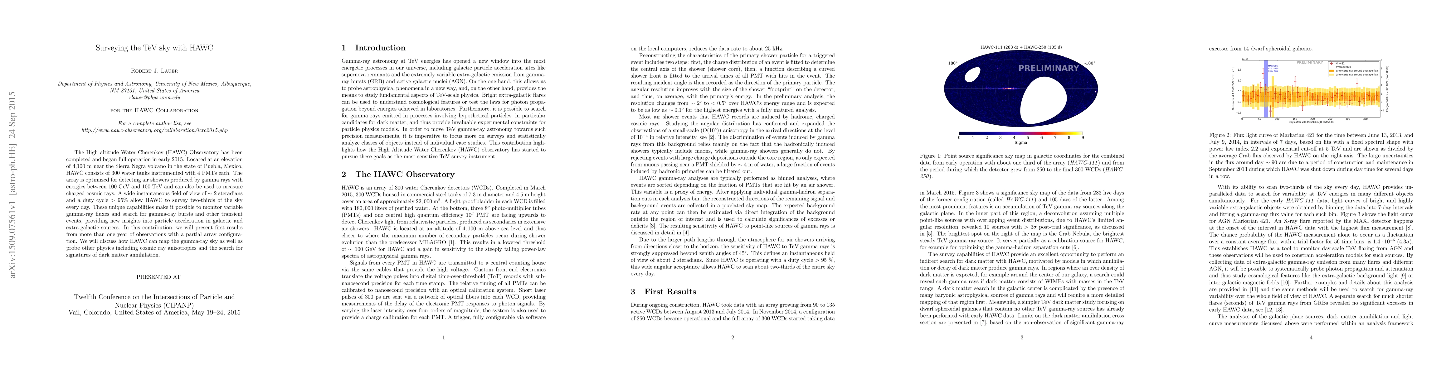 The HAWC Observatory, operational since 2015, surveys the TeV sky using an array of water tanks to detect high-energy gamma rays and cosmic rays. Initial results from over a year of observations reveal its potential to map gamma-ray sources and explore cosmic ray anisotropies and dark matter signatures.