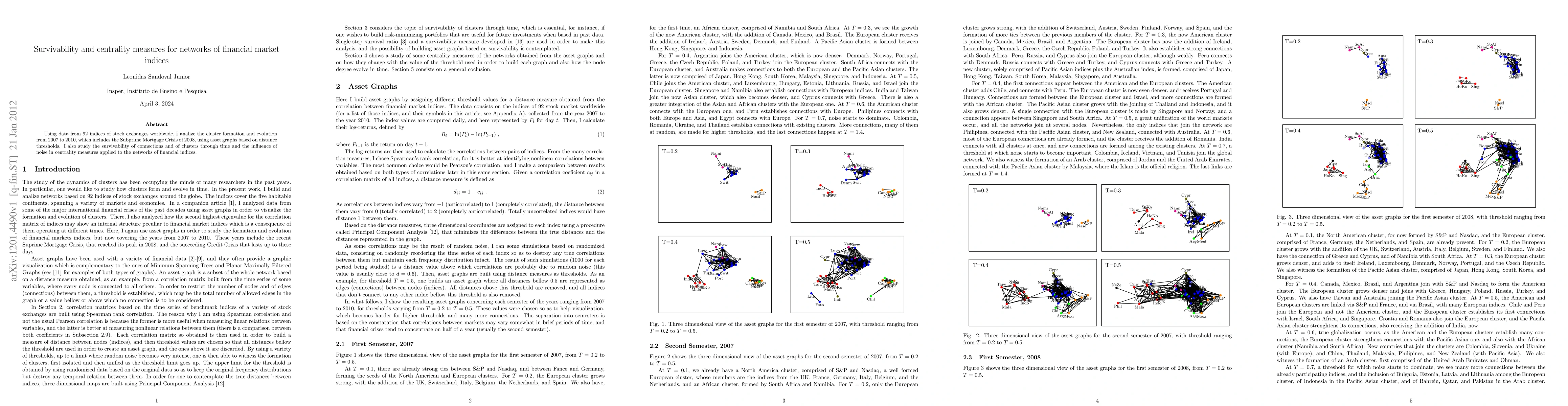 Using data from 92 indices of stock exchanges worldwide, I analize the cluster formation and evolution from 2007 to 2010, which includes the Subprime Mortgage Crisis of 2008, using asset graphs based on distance thresholds. I also study the survivability of connections and of clusters through time and the influence of noise in centrality measures applied to the networks of financial indices.